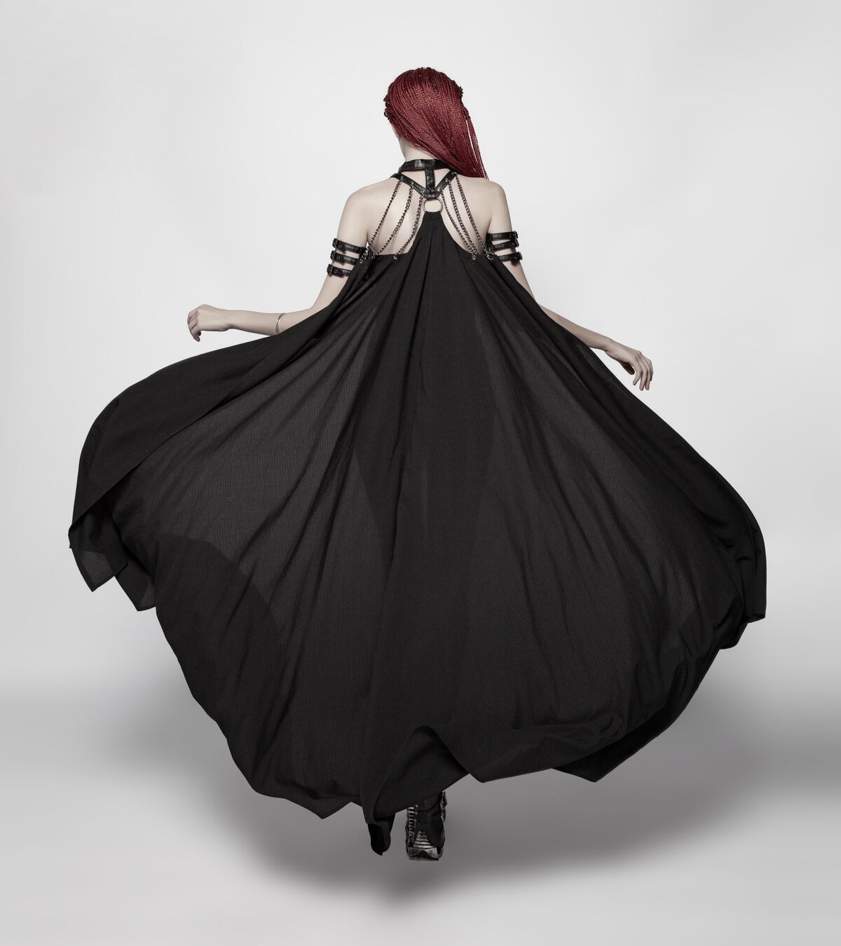 À l’arrière, une cape noire longue jusqu’au sol s’attache au ras-de-cou par six chaînes argentées, créant un mouvement ample et théâtral à chaque pas.