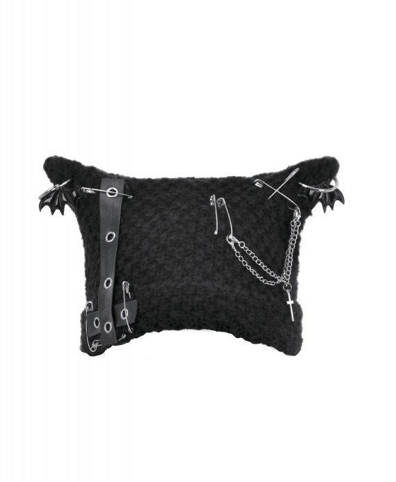 Le Bonnet Griffe Nocturne Dark in Love ne se contente pas de tenir chaud : il affirme une attitude. Sa maille noire dense sert de toile à une composition agressive de chaînes, d’épingles et de symboles métalliques, évoquant l’esthétique punk metal la plus radicale.