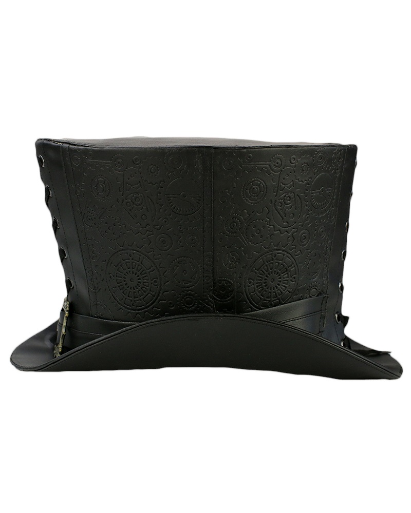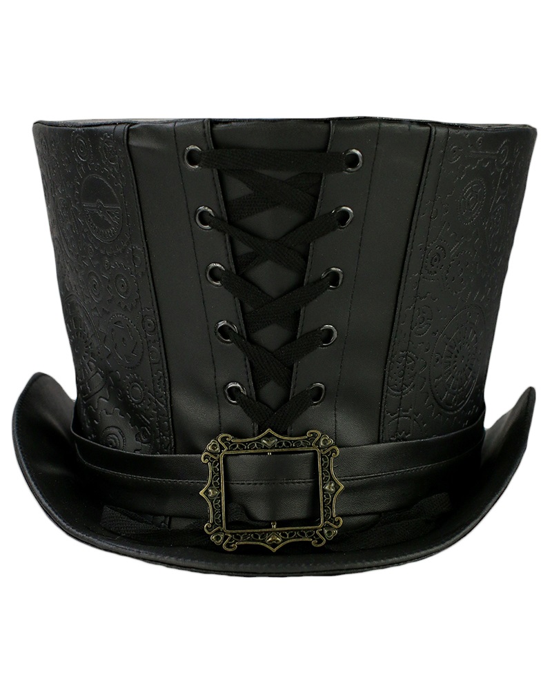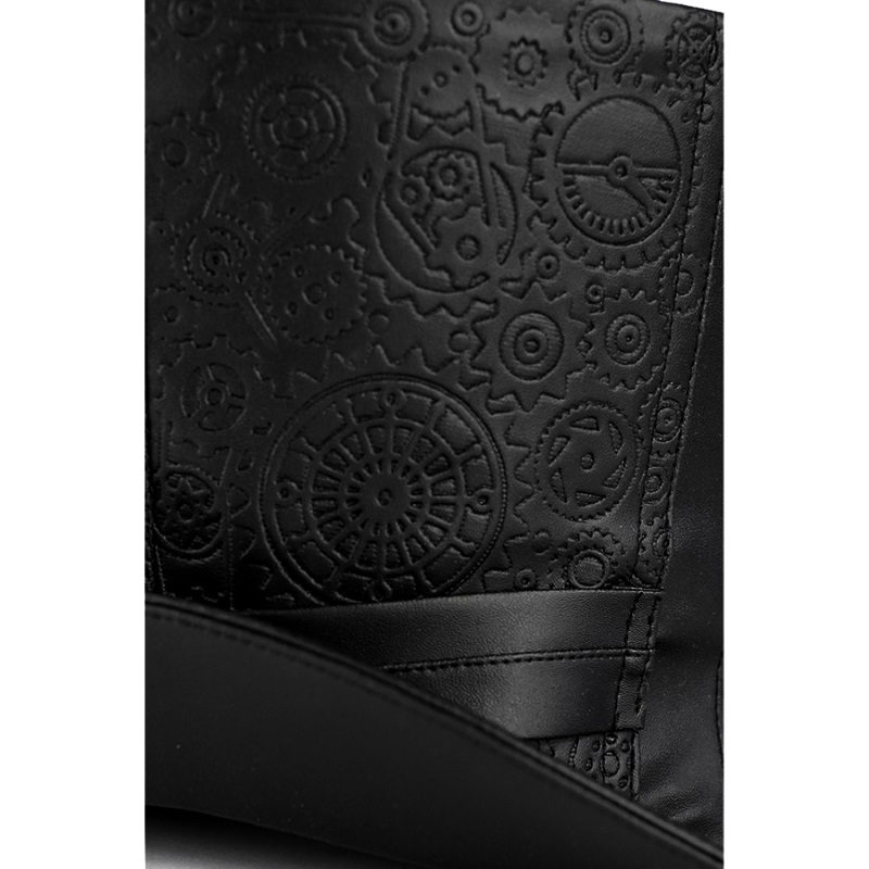Taillé dans un simili cuir noir avec embossage à chaud de motifs steampunk, il est agrémenté de beaux laçages de type corset à l'avant et à l'arrière , la coupe est légèrement évasée sur le haut et les bords sont relevés.
