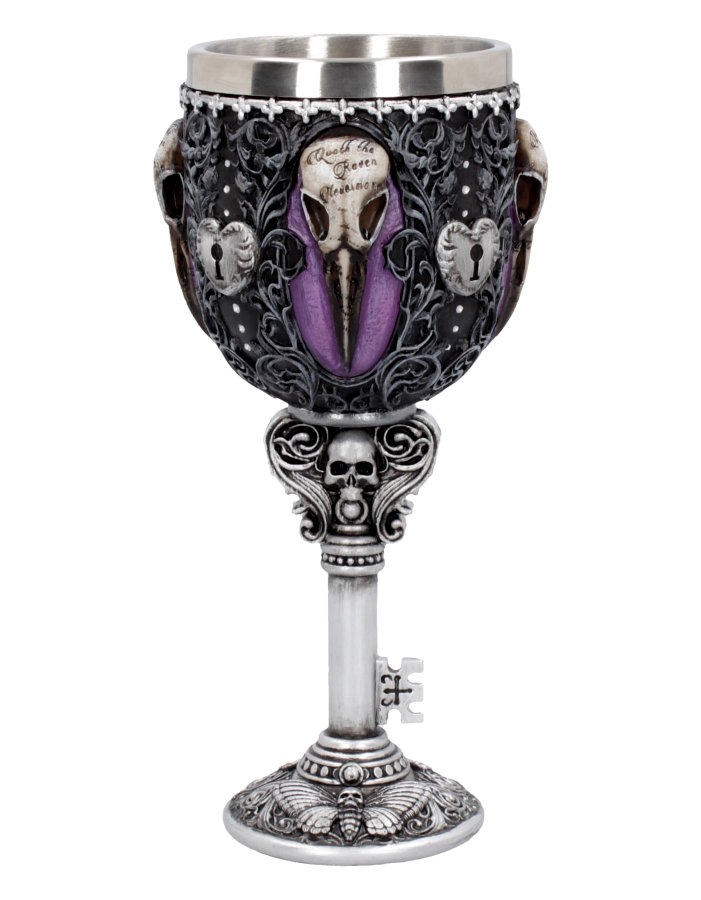Ses motifs baroques enveloppent la coupe comme un écrin ancien, tandis que les crânes de corbeau semblent murmurer les mots immortels : “Quoth the Raven, Nevermore.”