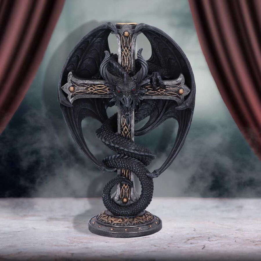 En spirale autour d'une croix avec des détails dorés se trouve ce dragon féroce aux yeux rouges perçants. Sa queue aux écailles pointues est enroulée autour de la tige de la croix tandis que de grandes ailes pointues protègent le dos.