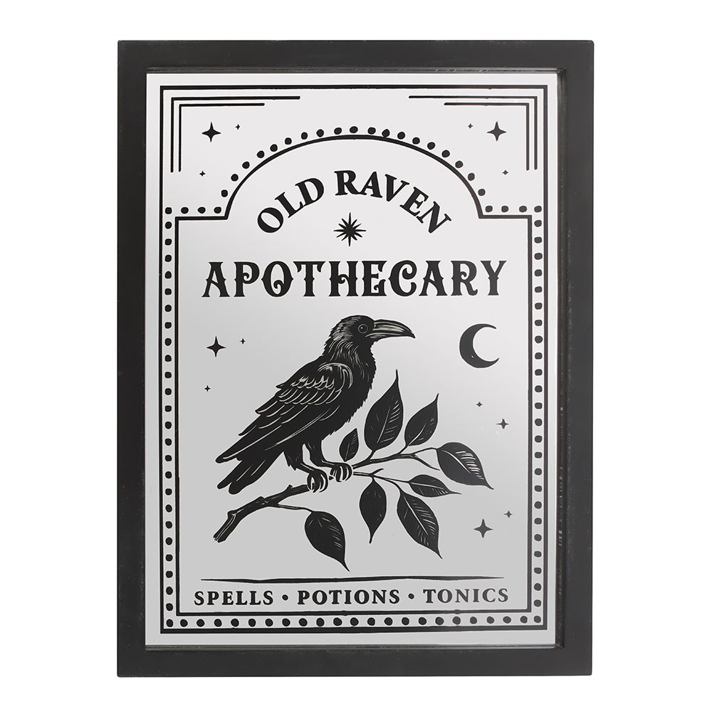 Le miroir mural Old Raven Apothecary s’inspire des anciennes officines et cabinets de curiosités. Son visuel reprend une étiquette d’apothicaire d’époque, ornée d’un corbeau majestueux et de délicats motifs botaniques, symboles de savoir occulte et de magie naturelle.