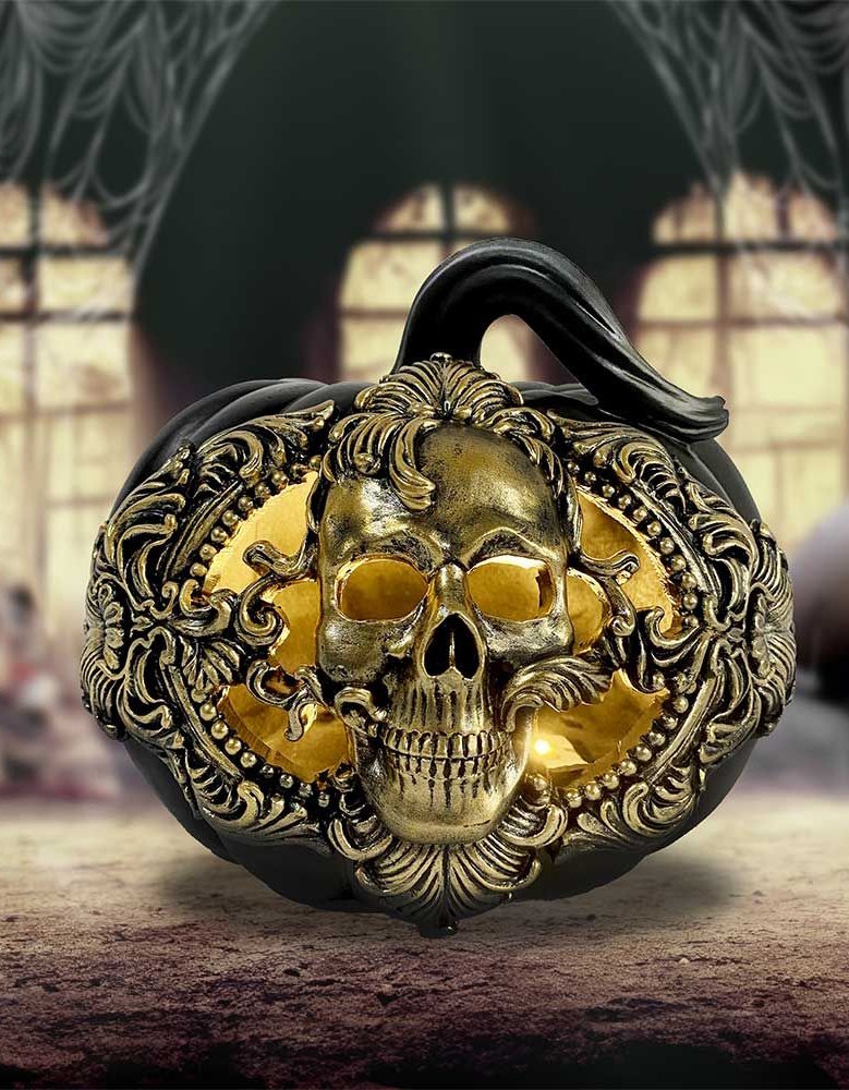 Citrouille noire mate avec crâne doré baroque ornemental