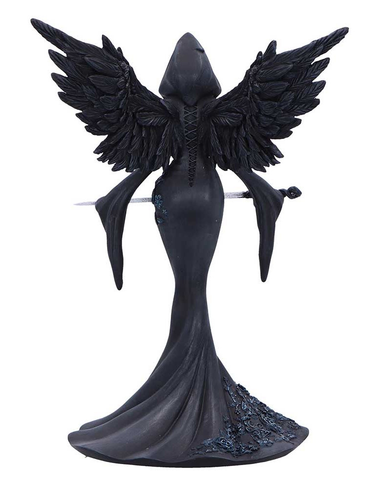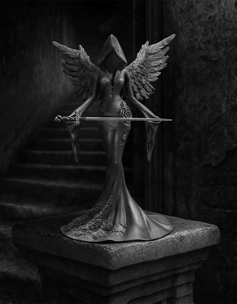 Entre ange déchu et gardienne de l’ombre, elle tient son arme avec une grâce froide, comme si le combat était déjà gagné.