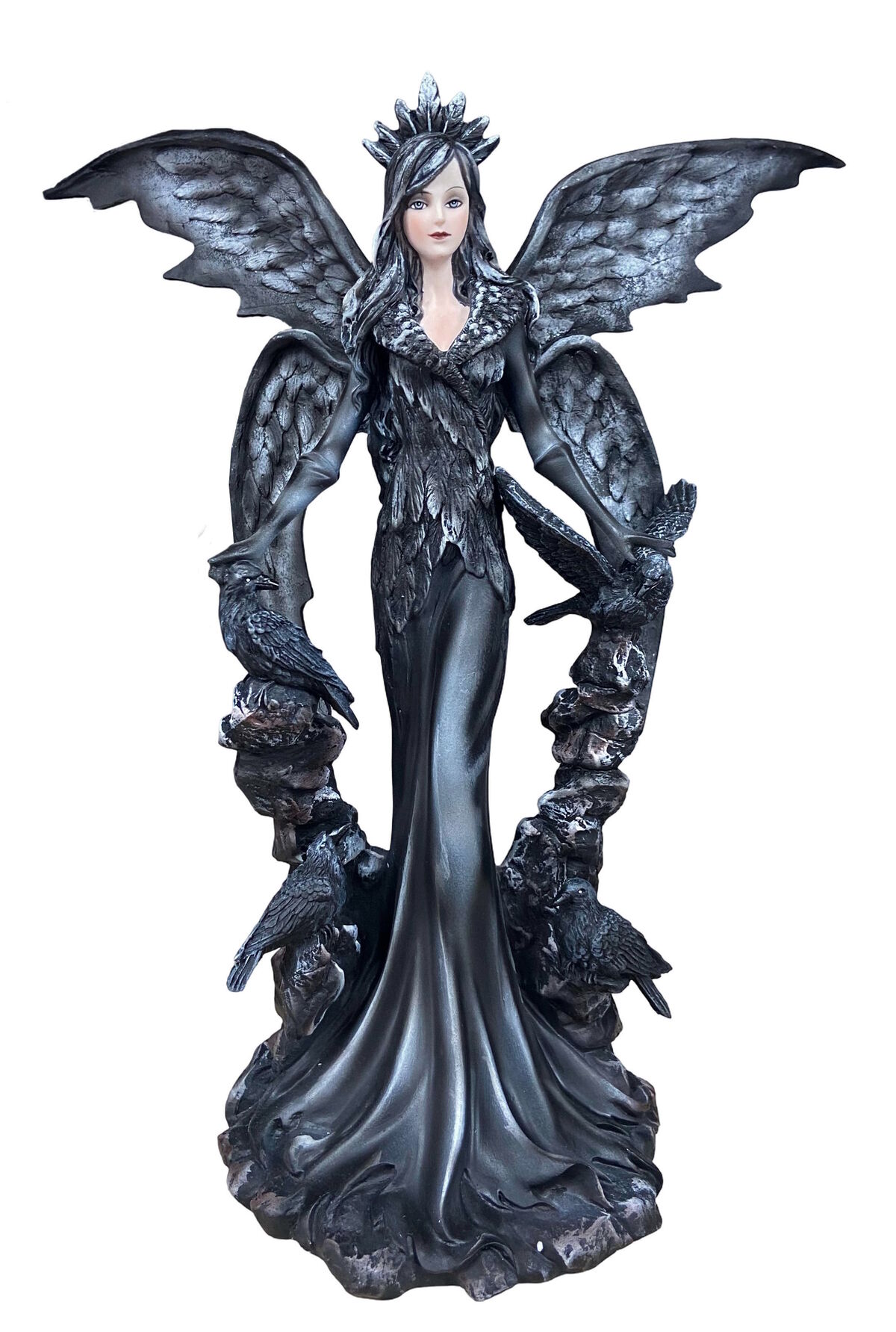 À ses pieds et dans ses mains se tiennent ses fidèles corbeaux, messagers de l’invisible. Chaque plume, chaque relief, chaque ombrage révèle un travail artisanal soigné, offrant une figurine d’une présence rare.