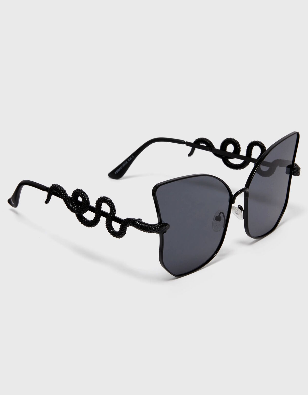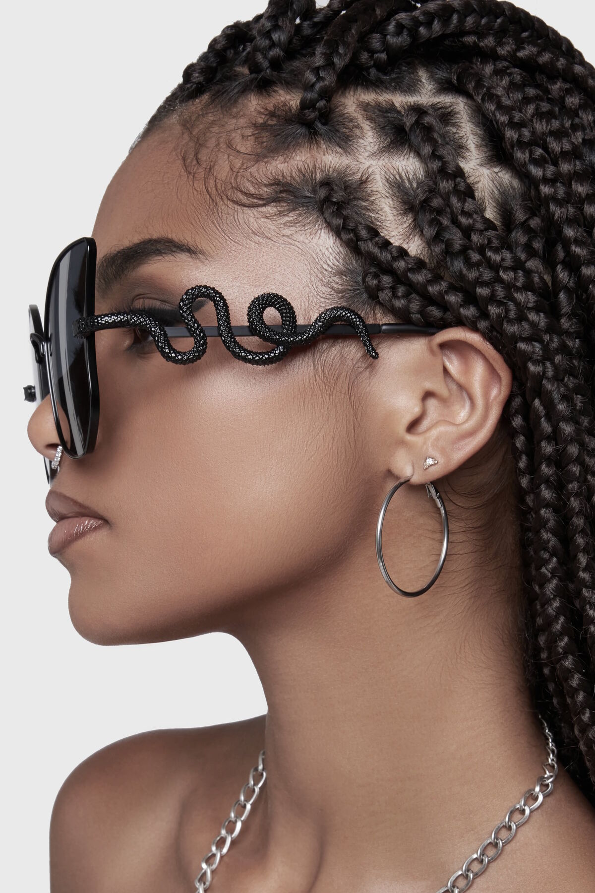 Leur monture oversize impose une présence immédiate, tandis que les branches serpentines sculptées ajoutent une dimension presque vivante à l’ensemble. Chaque détail évoque une esthétique sombre, élégante, légèrement venimeuse.