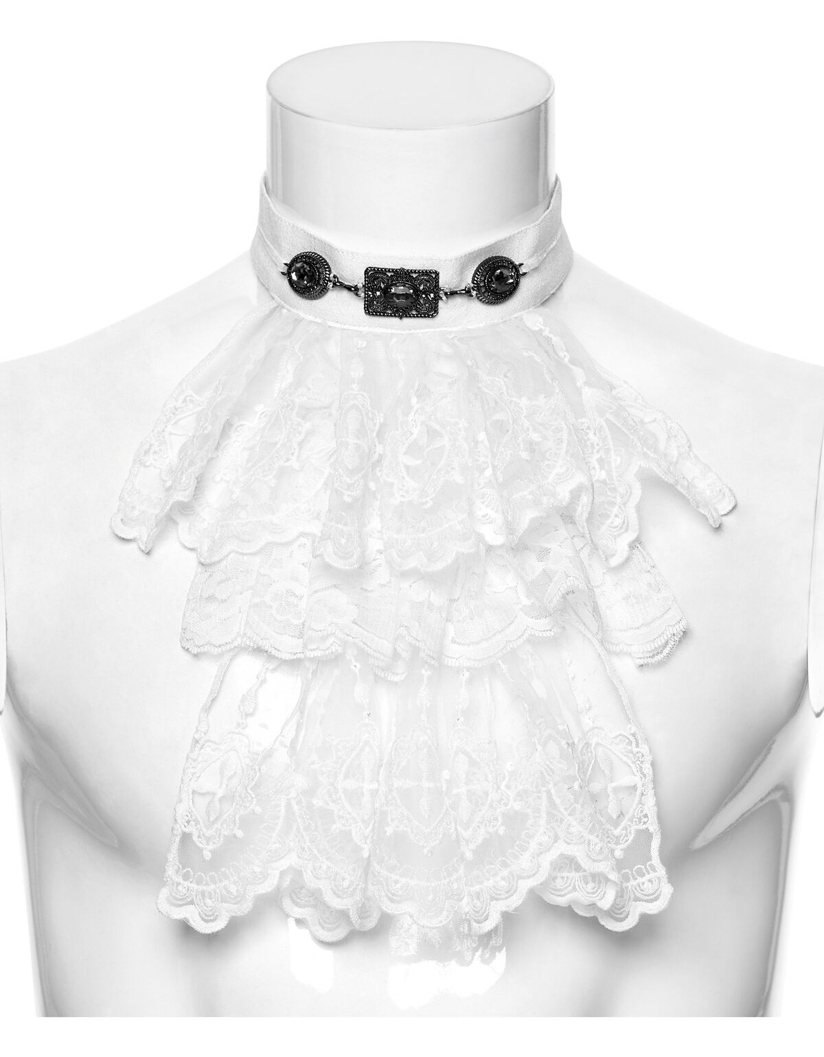 Le Jabot Ivoire Funèbre Punk Rave incarne une élégance rare, presque fantomatique. Sa dentelle blanche, délicatement ouvragée, évoque les salons feutrés, les bals oubliés et les silhouettes aristocratiques d’un autre siècle.