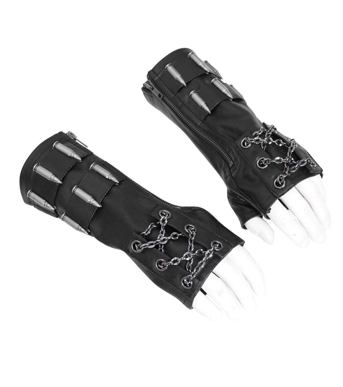 Avec Manus Tenebris, Devil Fashion impose une vision sombre et martiale de l’accessoire gothique. Ces mitaines se distinguent immédiatement par leurs fausses balles décoratives, alignées comme un symbole de pouvoir et de provocation, sans danger réel mais à l’impact visuel maximal.
