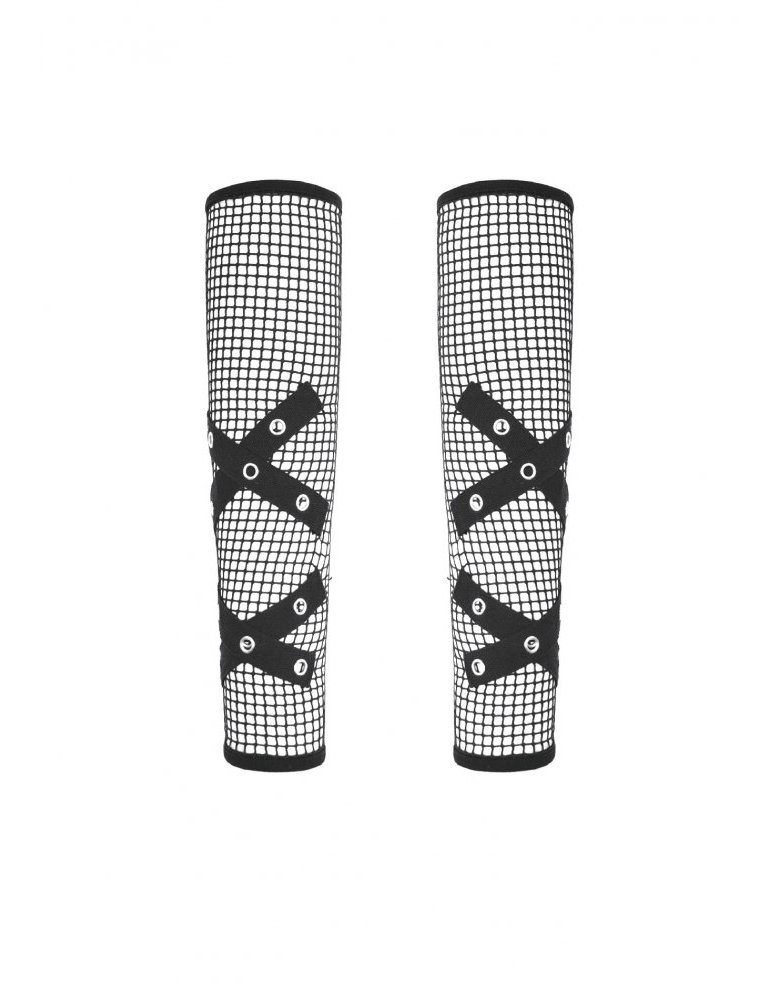 La résille épouse les bras avec légèreté, tandis que les sangles rivetées imposent une structure presque agressive.