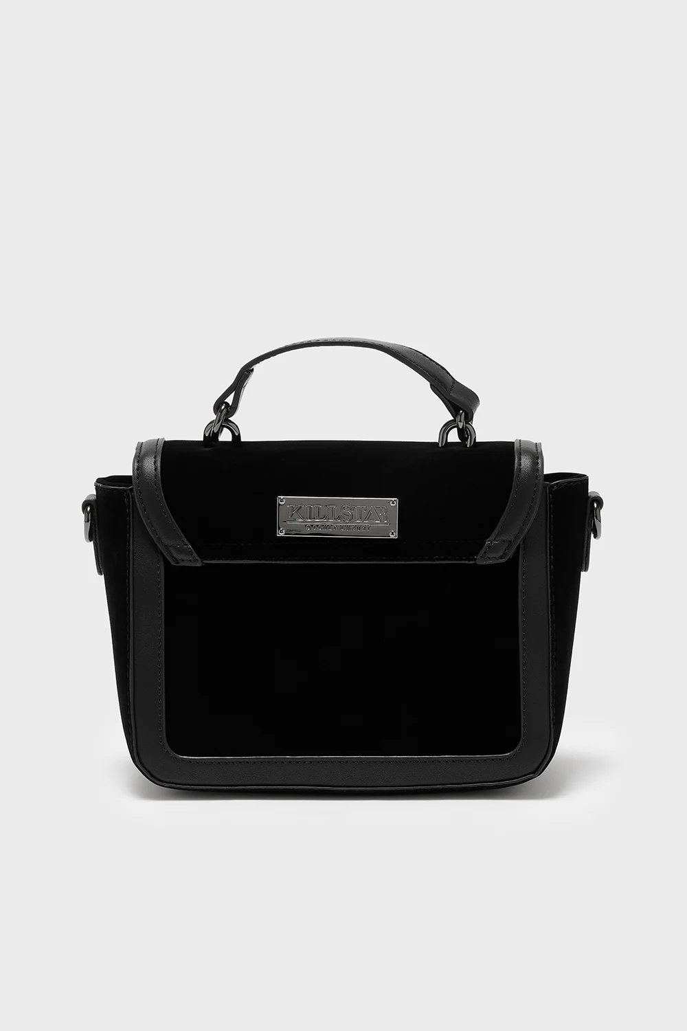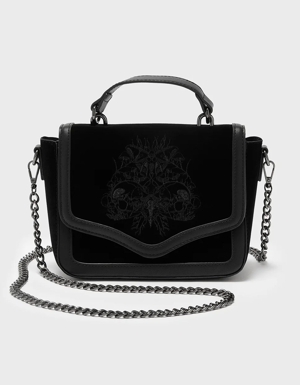 Sa matière velours noire, douce et profonde, contraste élégamment avec les bordures en PU vegan, tandis que la broderie monochrome crée un motif mystérieux inspiré des symboles floraux et funèbres.
