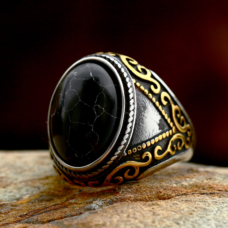 Mystérieuse et élégante, cette bague gothique met en valeur une pierre noire ovale à effet marbré, sertie dans un anneau travaillé aux finitions bronze vieilli. L’alliance du métal sombre et des arabesques dorées crée un contraste saisissant, parfait pour un style raffiné et ésotérique.
