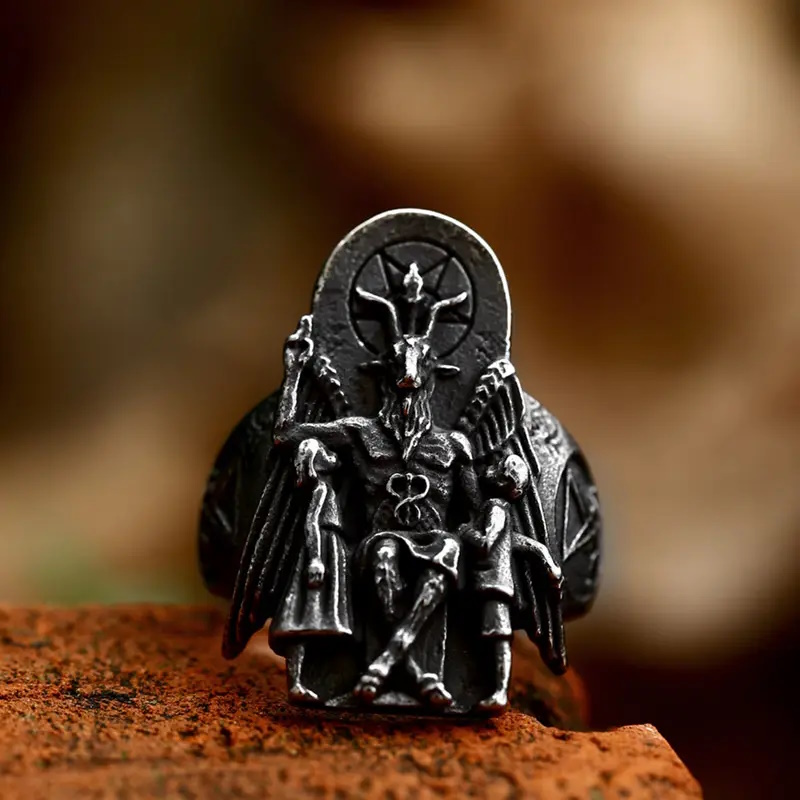 Bague satanique représentant le terrifiant Baphomet sur son trône