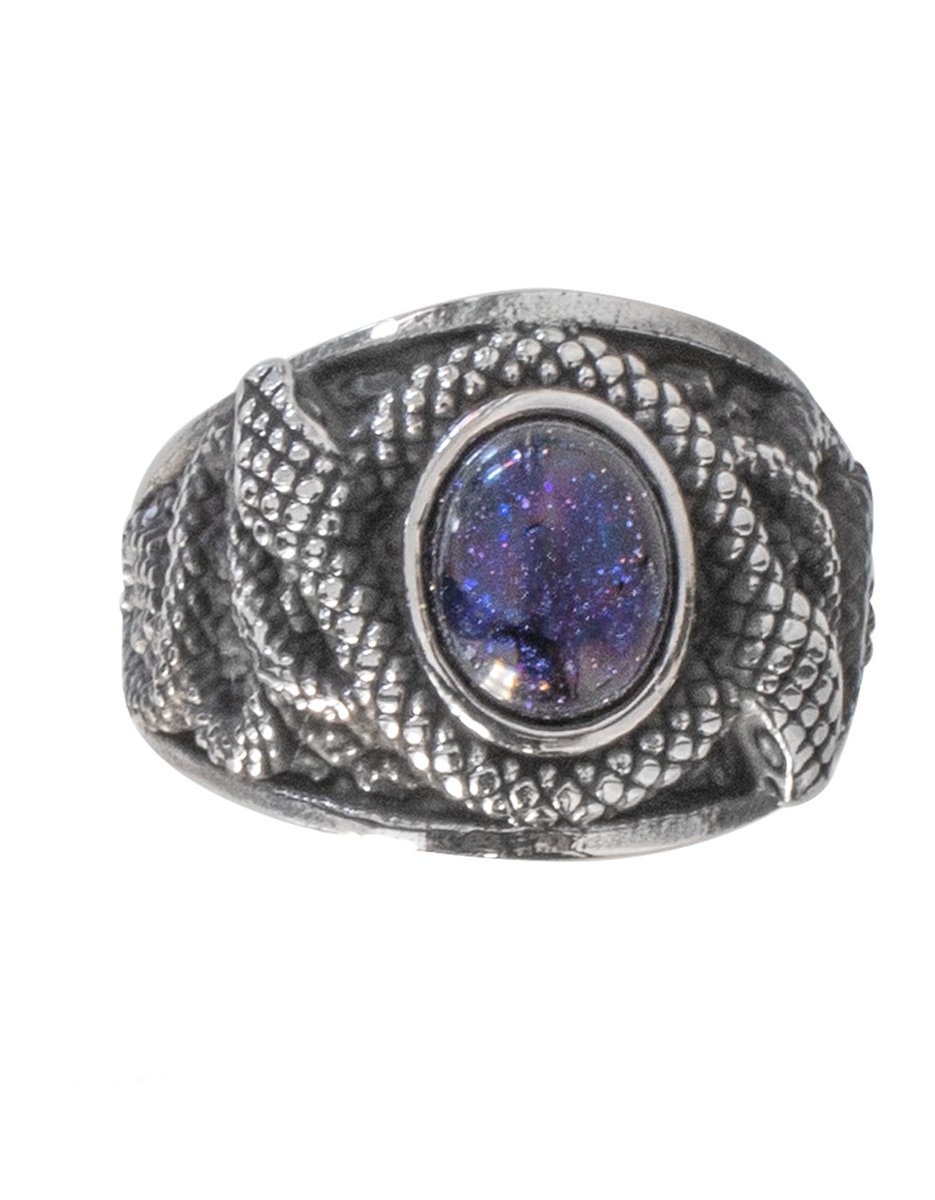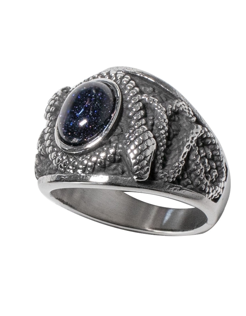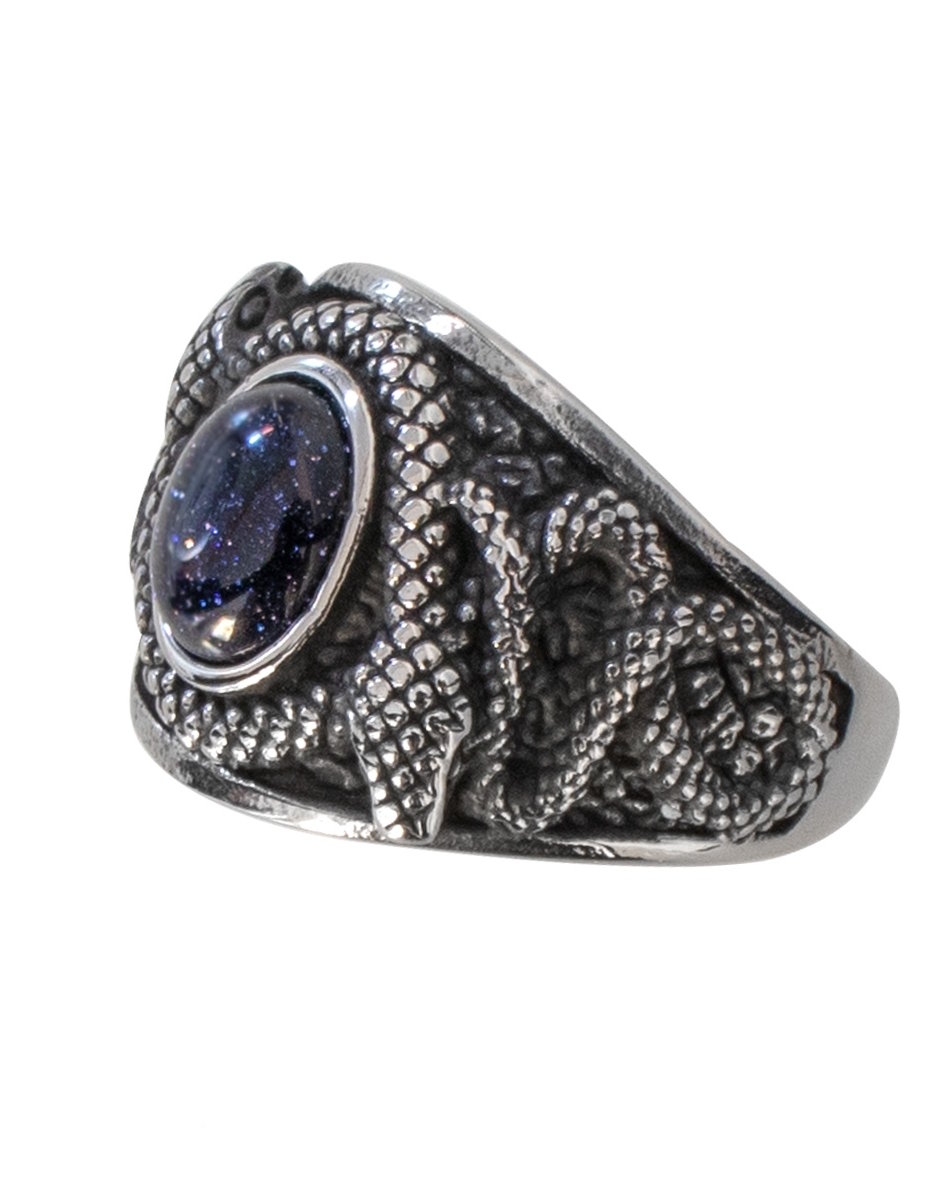 Le serpent, finement sculpté, s’enroule autour d’une pierre noire aux reflets cosmiques, comme s’il protégeait un fragment d’univers. Chaque détail du corps reptilien apporte du relief et une sensation organique, presque vivante.