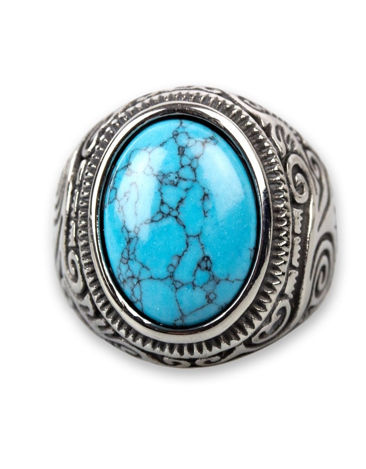 Sa pierre turquoise aux veines naturelles semble capturer un fragment d’océan figé dans le métal. Autour, l’acier sculpté dévoile des arabesques profondes, presque mystiques, évoquant des symboles anciens oubliés.