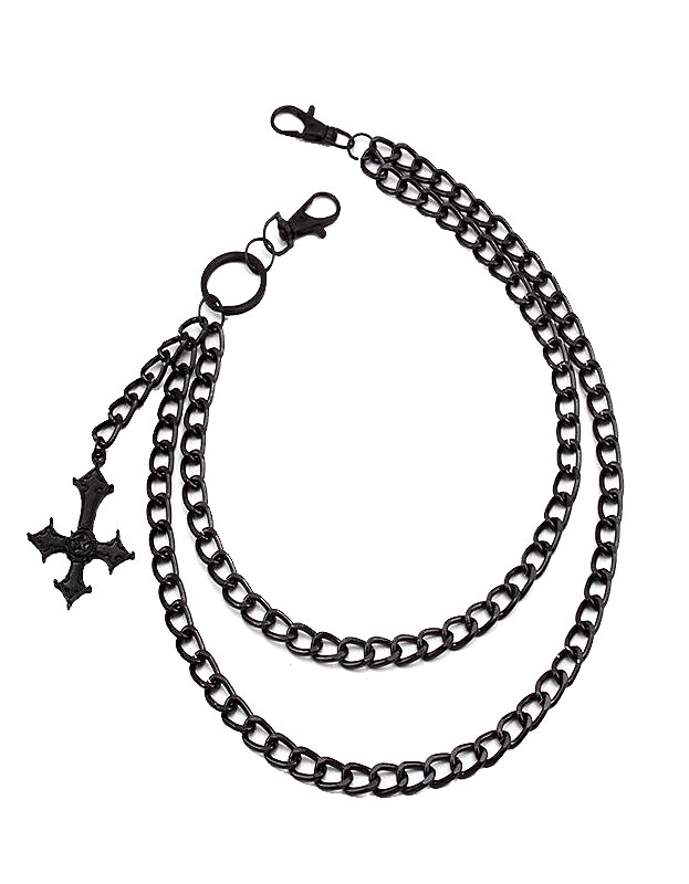 Les deux chaînes dessinent une ligne sobre et tendue le long de la hanche, laissant le symbole central s’imposer sans détour.