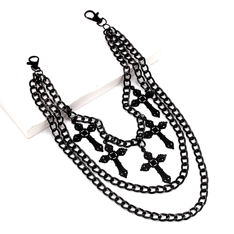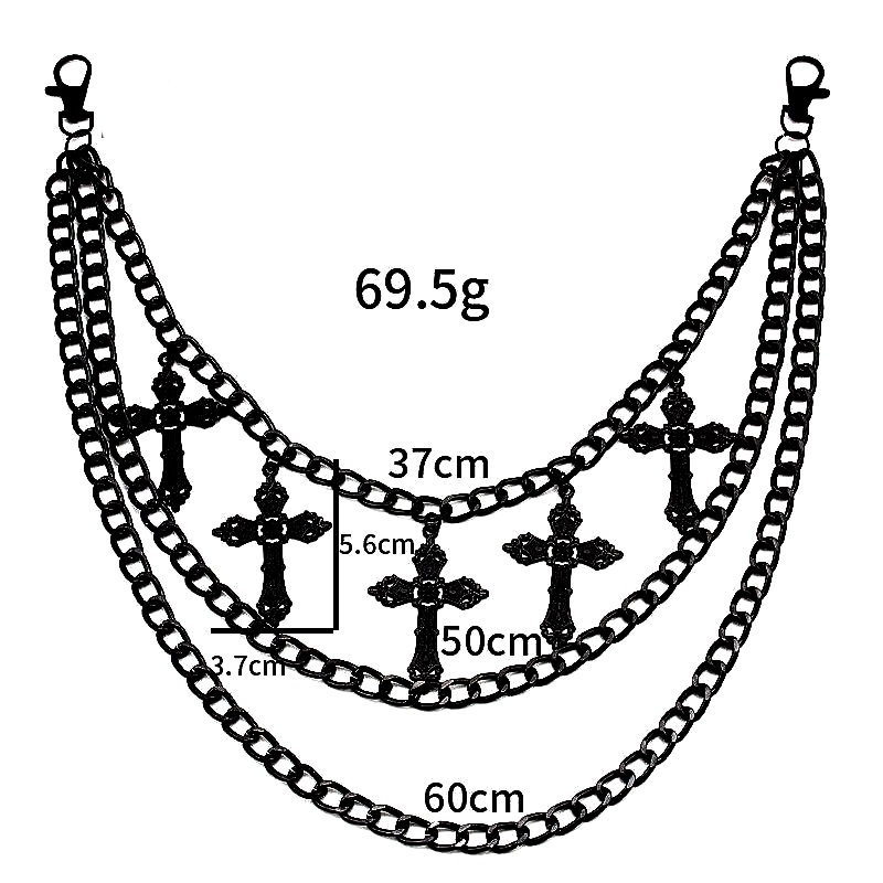 La Crucifix Dominion déploie trois rangées de chaînes sombres, dominées par cinq croix gothiques alignées sur la chaîne supérieure, comme un chapelet profane suspendu à la hanche.