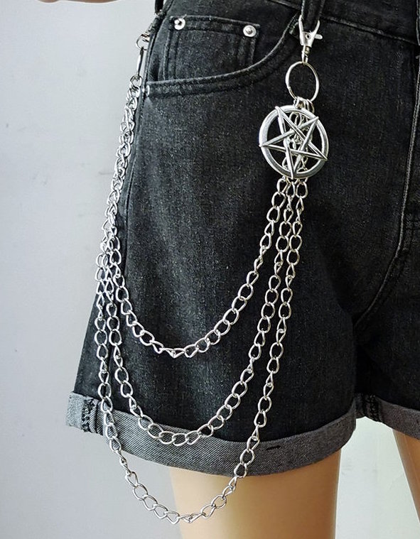 Portée sur un short noir, un pantalon gothique ou un jean sombre, cette chaîne devient un manifeste visuel, entre provocation rituelle et style alternatif assumé.