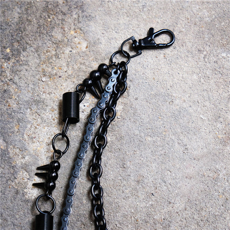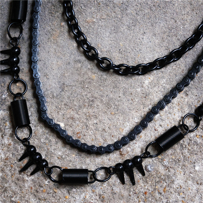Chaînes noires superposées, ressorts métalliques et pointes rivetées composent une ligne agressive, inspirée des univers industrial, post-punk et dark streetwear.