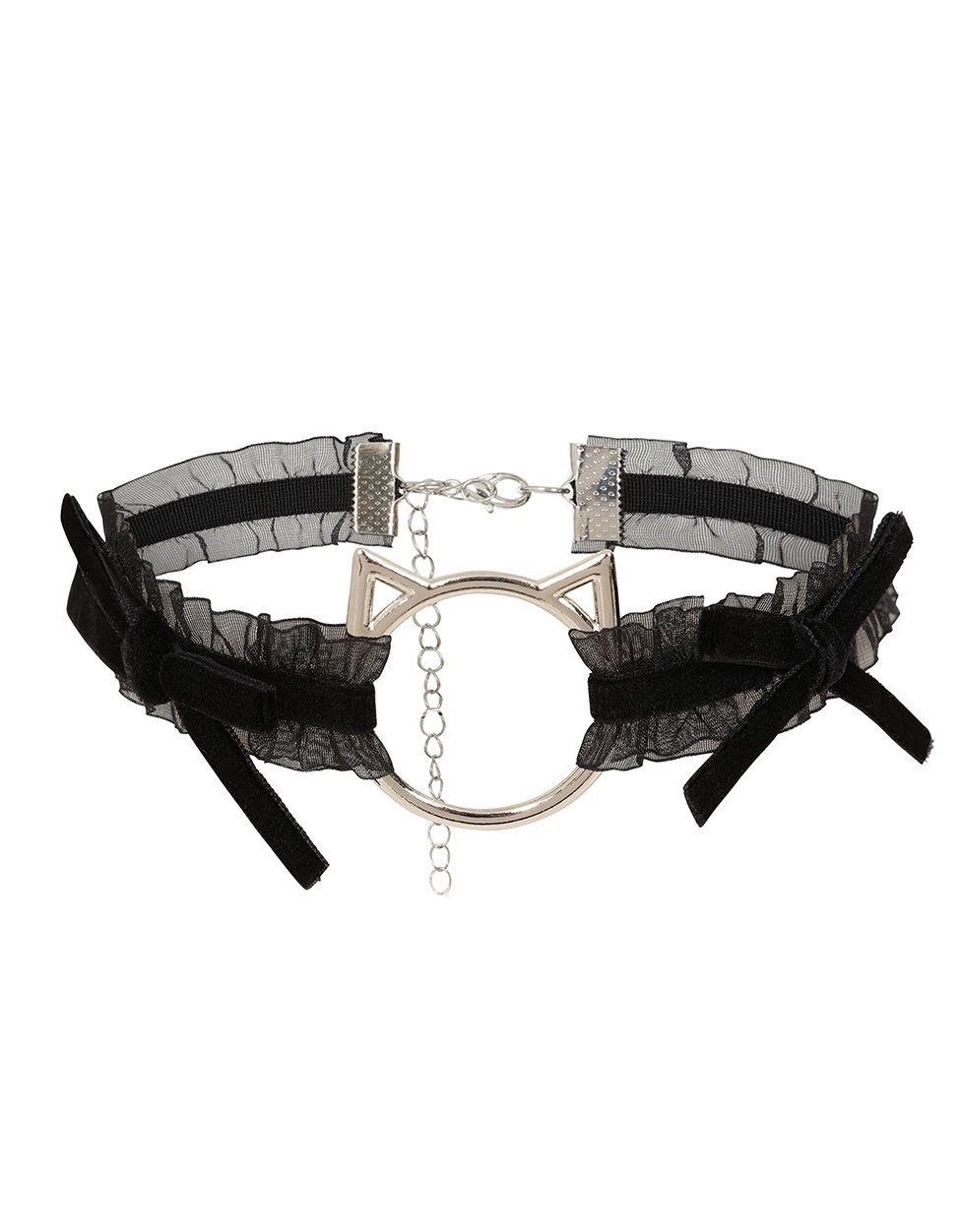 Orné d'un luxueux noeud en velours et d'un anneau chat original, ce collier est l'accessoire idéal pour les adeptes de la mode alternative.