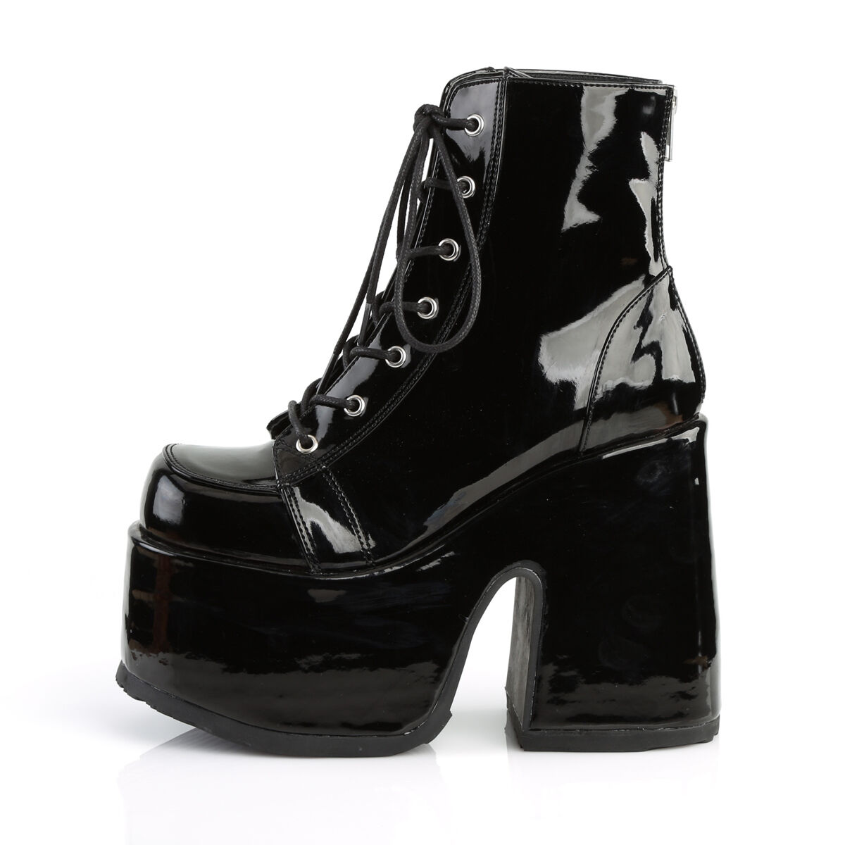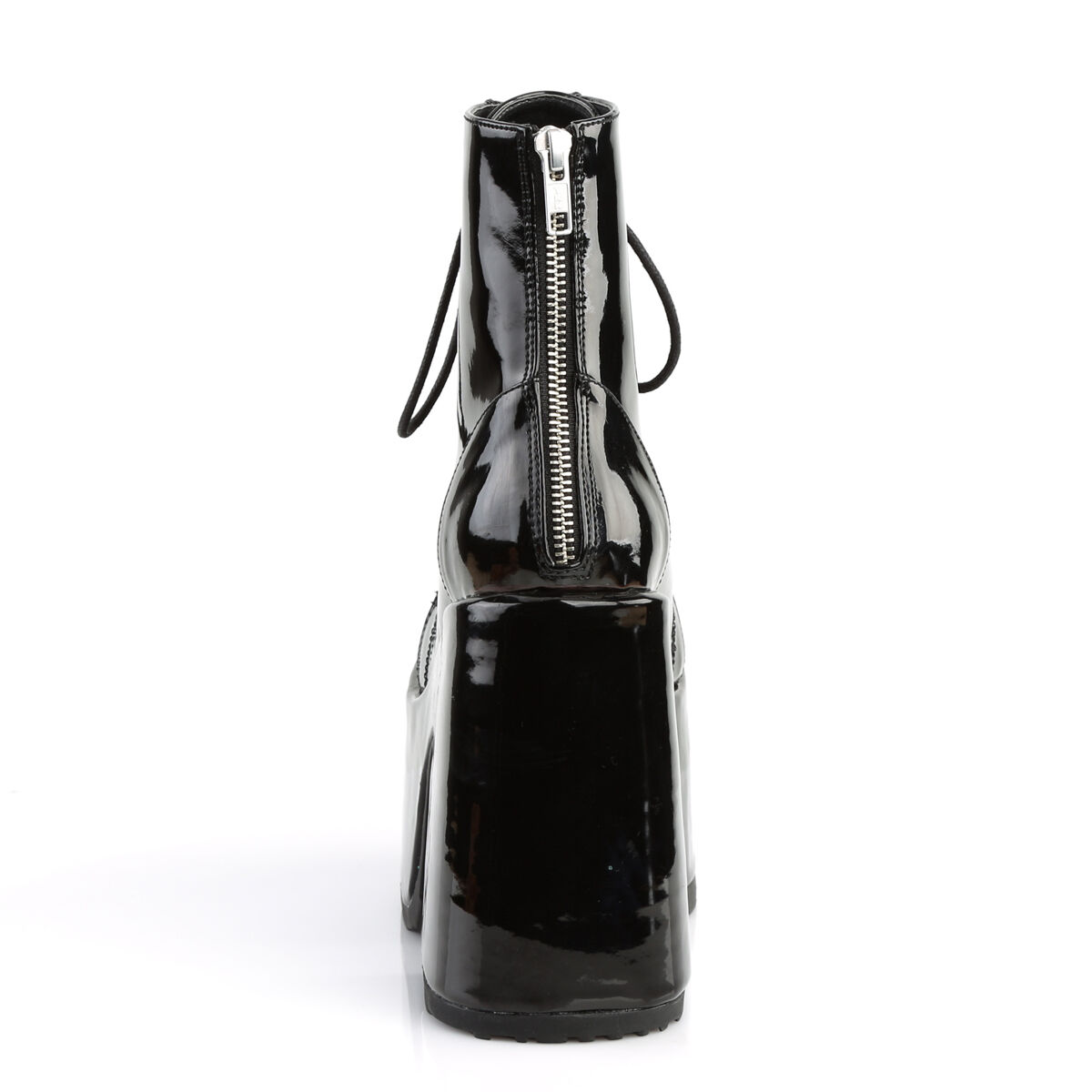 Icône de la ligne CAMEL, la 203 combine une tige courte à laçage pour l’ajustement et un zip arrière intégral pour la praticité. La plateforme haute mais stable allonge la silhouette sans sacrifier l’équilibre. Le verni noir capte la lumière et signe un look goth/punk/club immédiatement reconnaissable - avec mini-robe, short vinyle ou jean destroy.