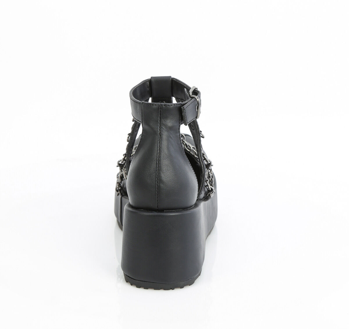 Leur plateforme compacte élève la silhouette sans l’alourdir, tandis que la cage de sangles dessine une géométrie précise autour du pied. Les D-rings et chaînes ajoutent une tension métallique subtile, créant du mouvement et de la texture à chaque pas.
