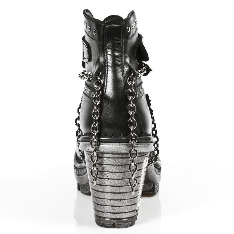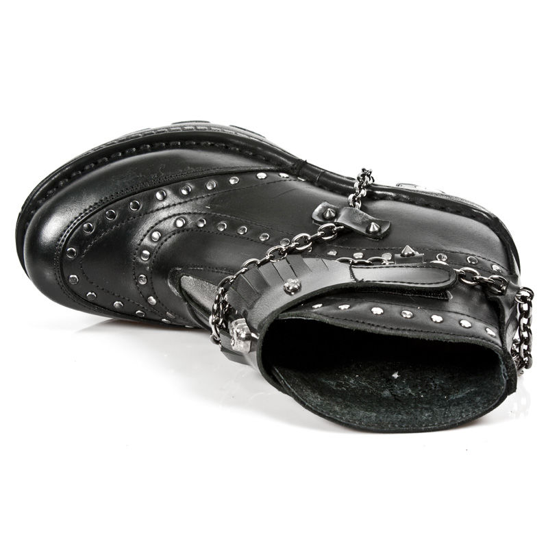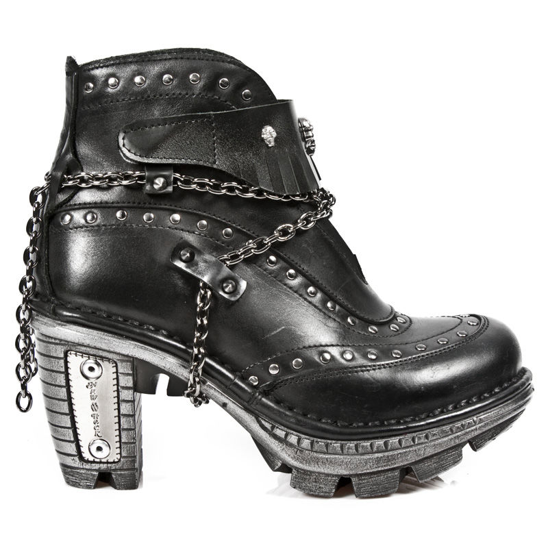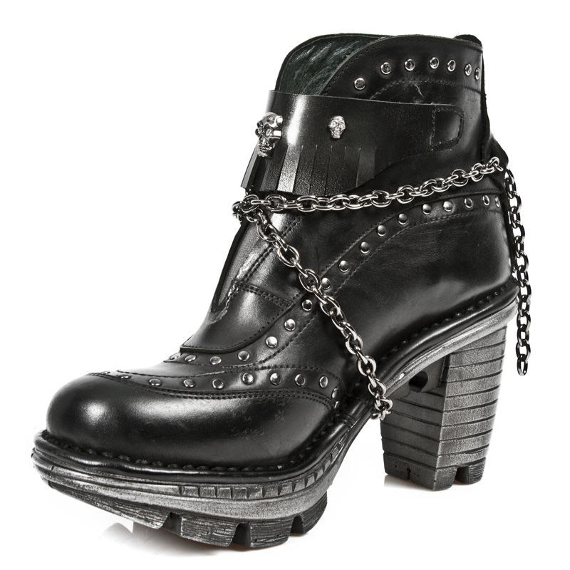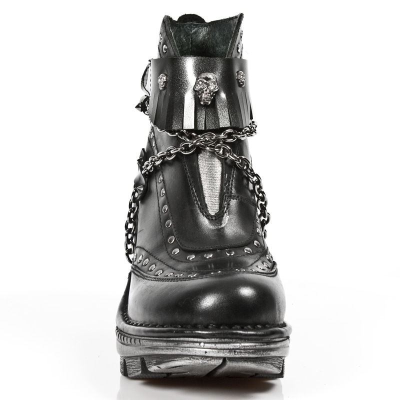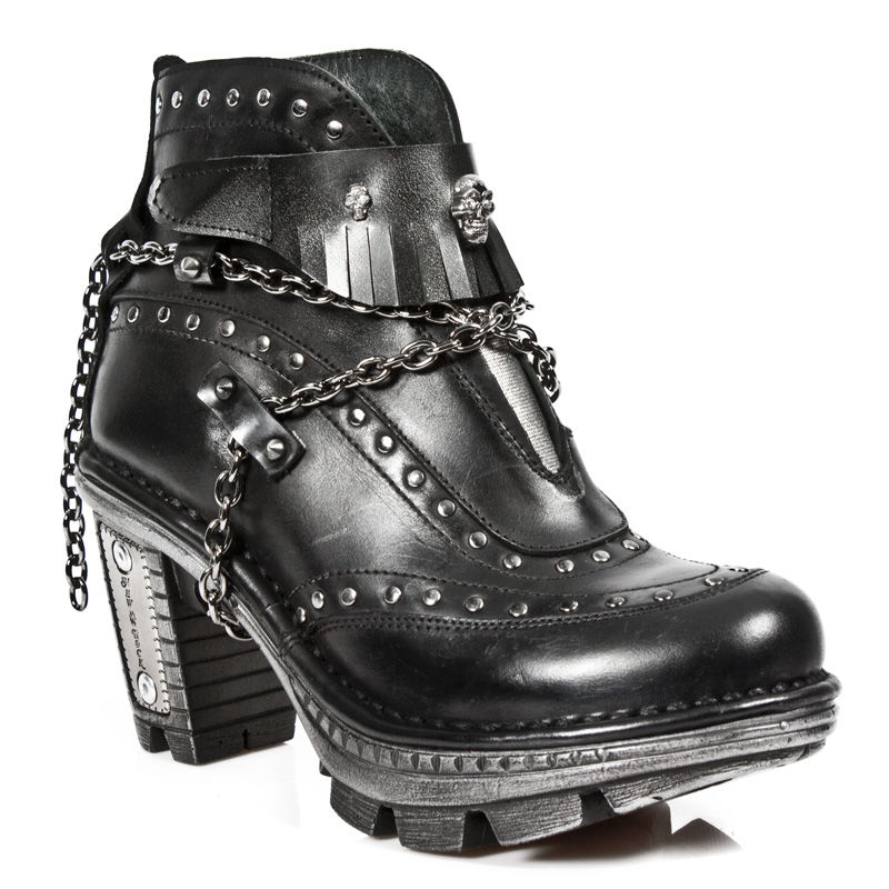Superbes bottines style low boots à talons. Ce cuir noir d'une qualité exceptionnelle a été entièrement assemblé à la main pour votre plus grand plaisir. En plus d'un confort inégalable, et ce même avec des talons de 9 cm, ces bottines vous apporterons un style hors du commun. Toute l'originalité de cette chaussure réside dans ces petits détails métalliques classiques chez la marque New Rock. Des rivets qui ornent chaque courbe de cette bottines, en passant par les chaînes qui font le tour du pied, et jusqu'à la plaque en métal gravée du nom de la marque sur le flanc du talon. Une lanière à franges agrémentée d'une tête de mort en métal vient fermer l'avant de la chaussure et apporter une légère touche western à ce look très rock.