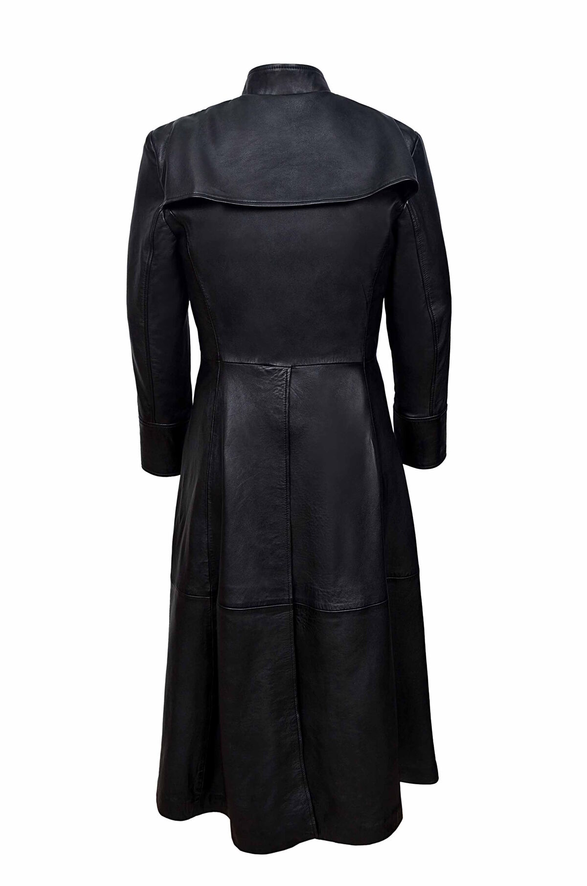 Son col officier à boutons-pression évoque l’uniforme futuriste du héros de The Matrix, tandis que sa coupe longue et ajustée allonge la silhouette et dégage une aura d’autorité.