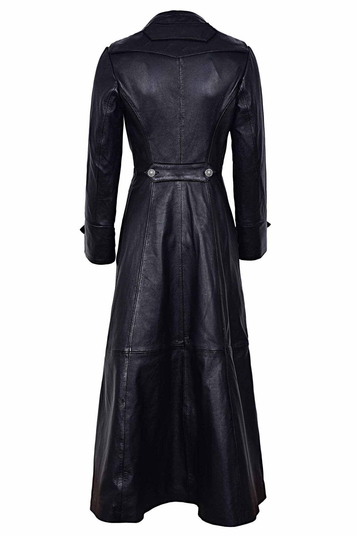 Les détails métalliques - boutons argentés, zip croisé, surpiqûres précises - lui confèrent un caractère martial et théâtral, tandis que la coupe longue évasée évoque les héroïnes victoriennnes et les souveraines ténébreuses.