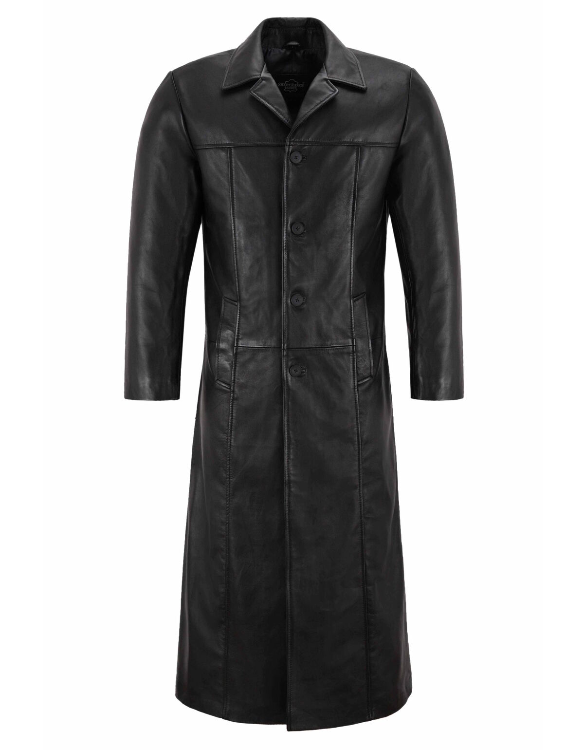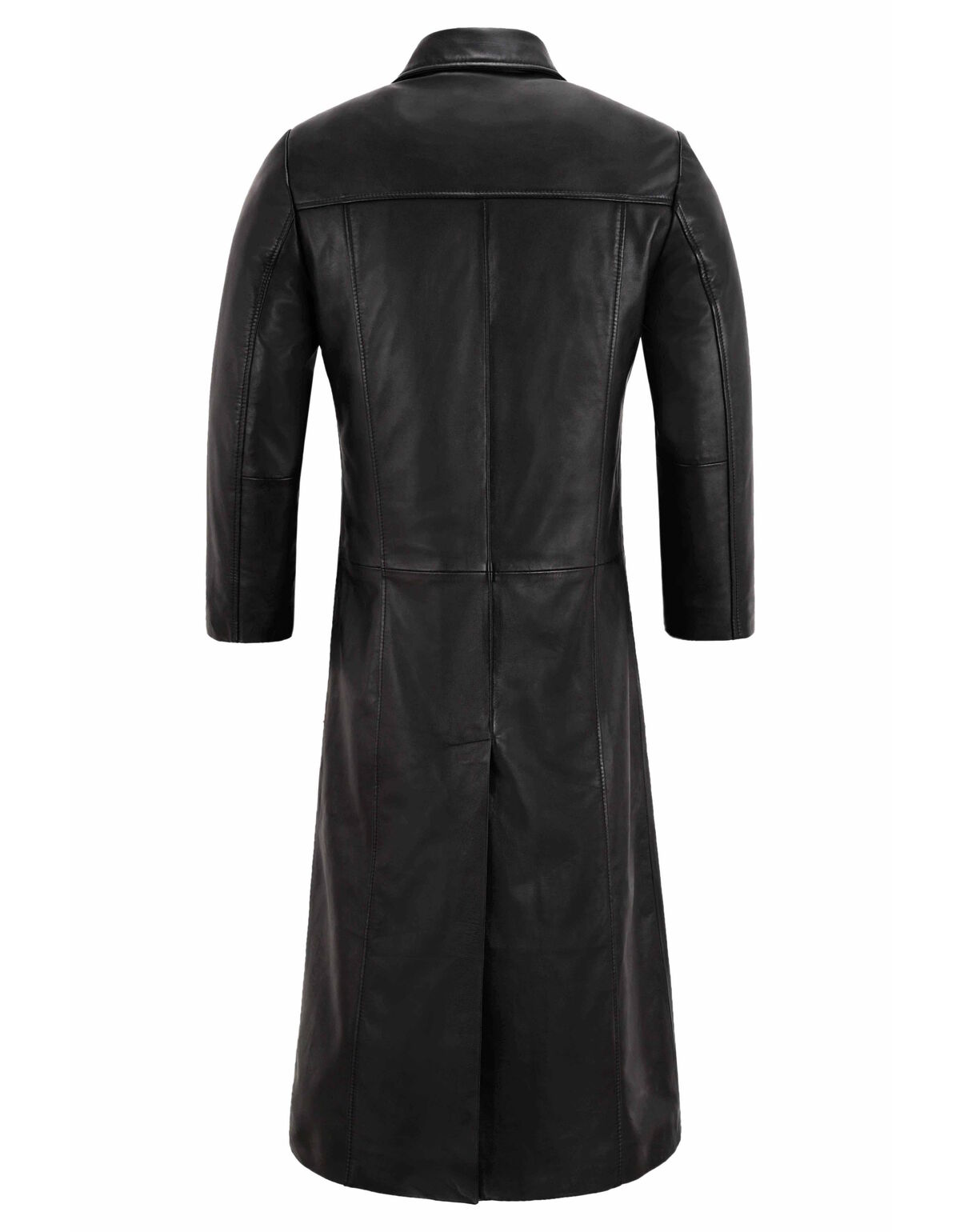 Ce manteau long en cuir noir allie élégance et force brute.