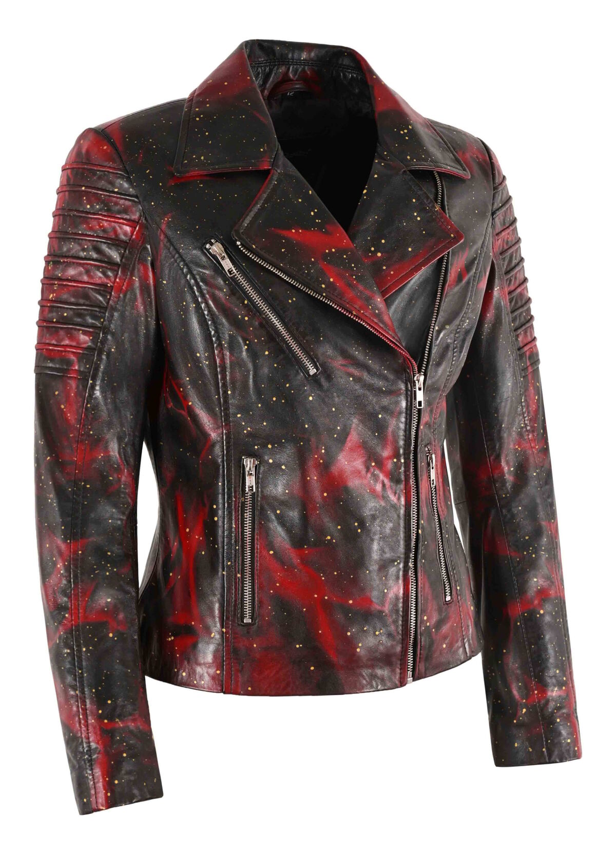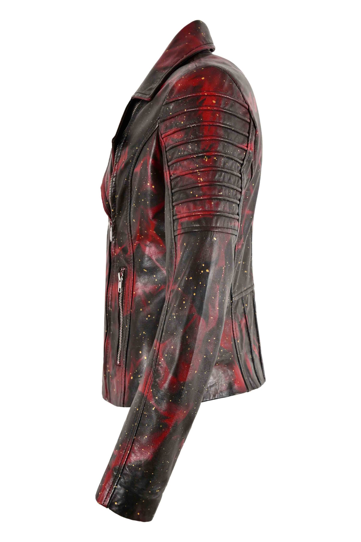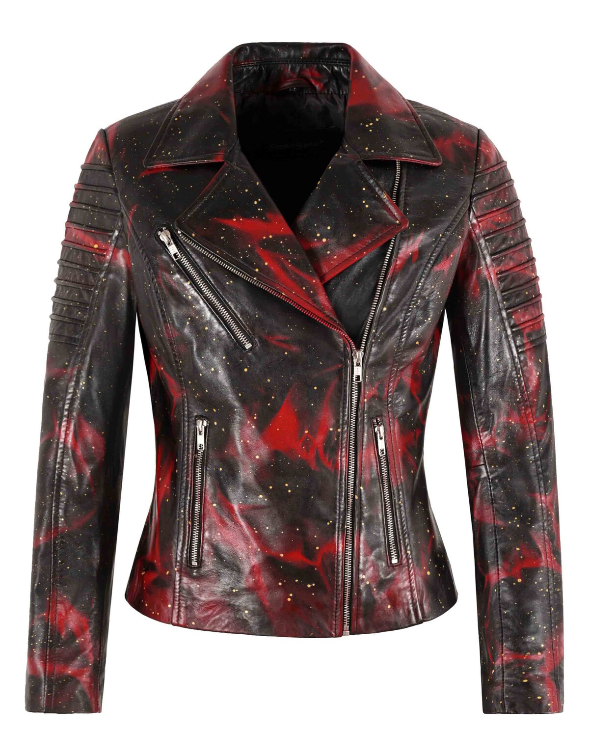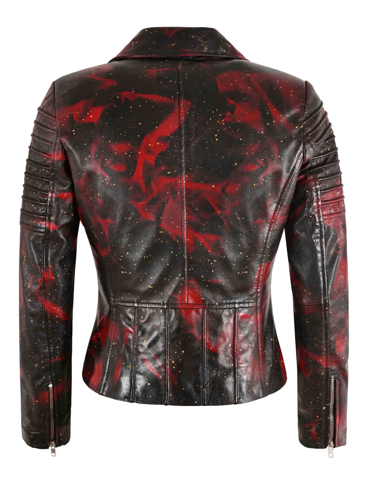Fusion parfaite entre le glamour et l’obscurité, la veste Supernova Red Spark évoque une explosion céleste figée dans le cuir.