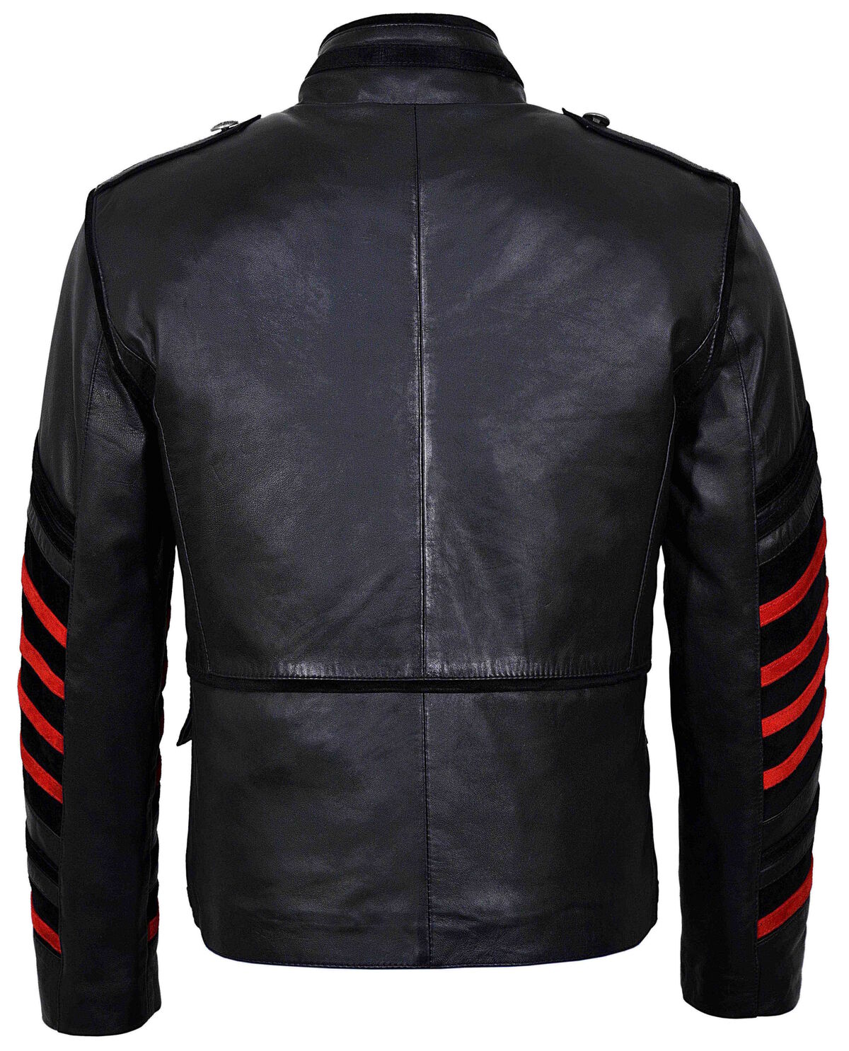 Son cuir d’agneau noir, d’une douceur exceptionnelle, contraste avec les bandes en suédine rouge écarlate qui serpentent le long des manches - symbole d’autorité et de passion.