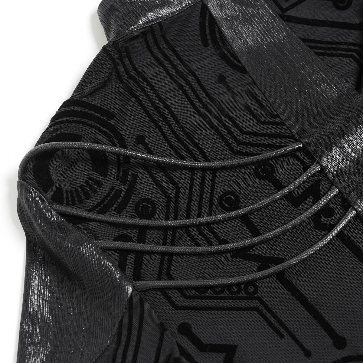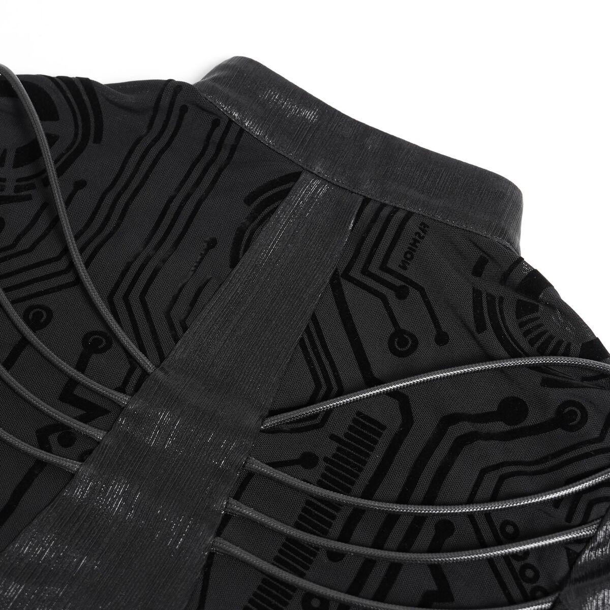 Sa base noire légèrement brillante épouse la silhouette comme une seconde peau, tandis que les motifs circuits imprimés tracent un réseau sombre et organique à la surface du tissu.