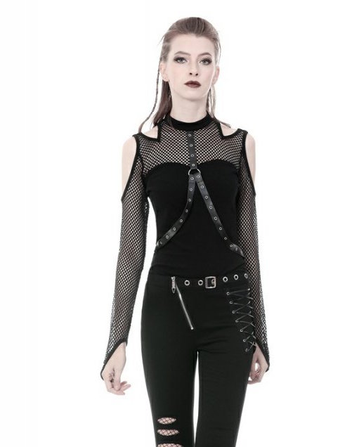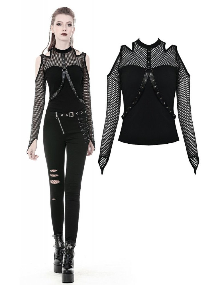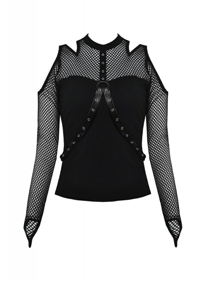 Le Haut Résille Insoumise Dark in Love incarne une esthétique punk assumée, à la frontière du sexy et du subversif. Sa résille fine laisse deviner la peau, tandis que les découpes aux épaules et le harnais frontal imposent une lecture plus radicale, presque provocatrice.