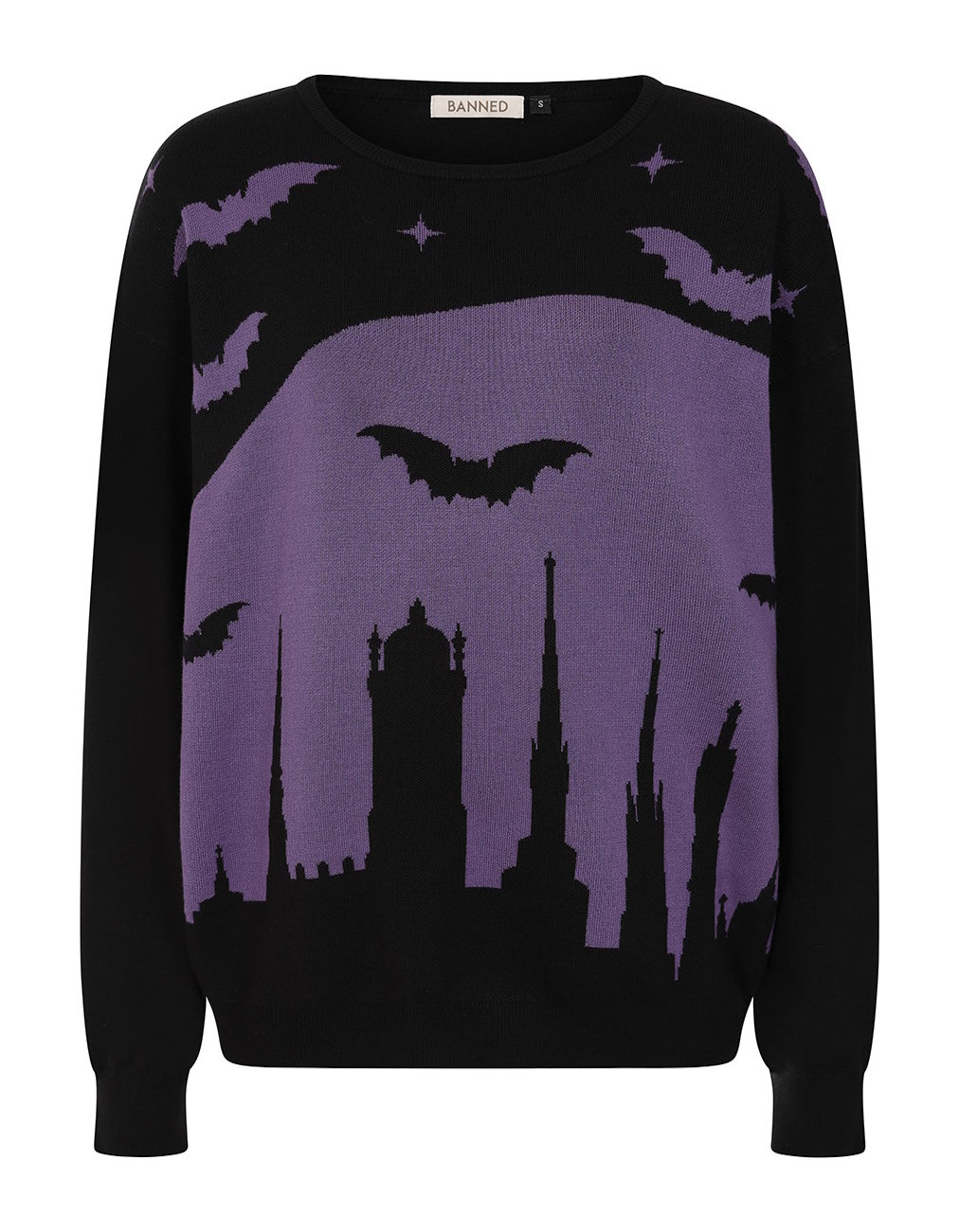 Ce pull gothique signé Banned Apparel déploie un paysage urbain spectral dans des nuances de violet profond.