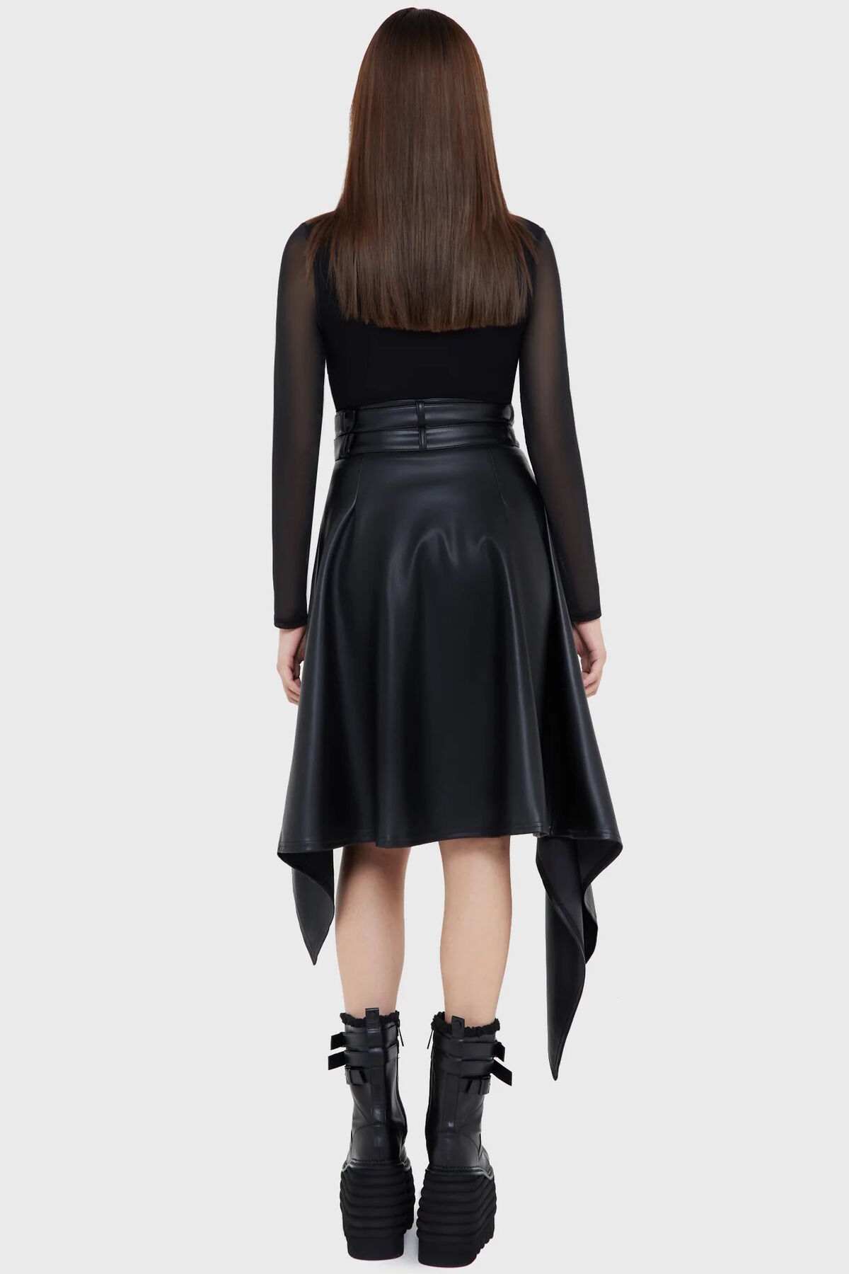 Son PU souple épouse les formes sans rigidité, tandis que l’ourlet asymétrique donne une allure théâtrale, presque sculpturale.