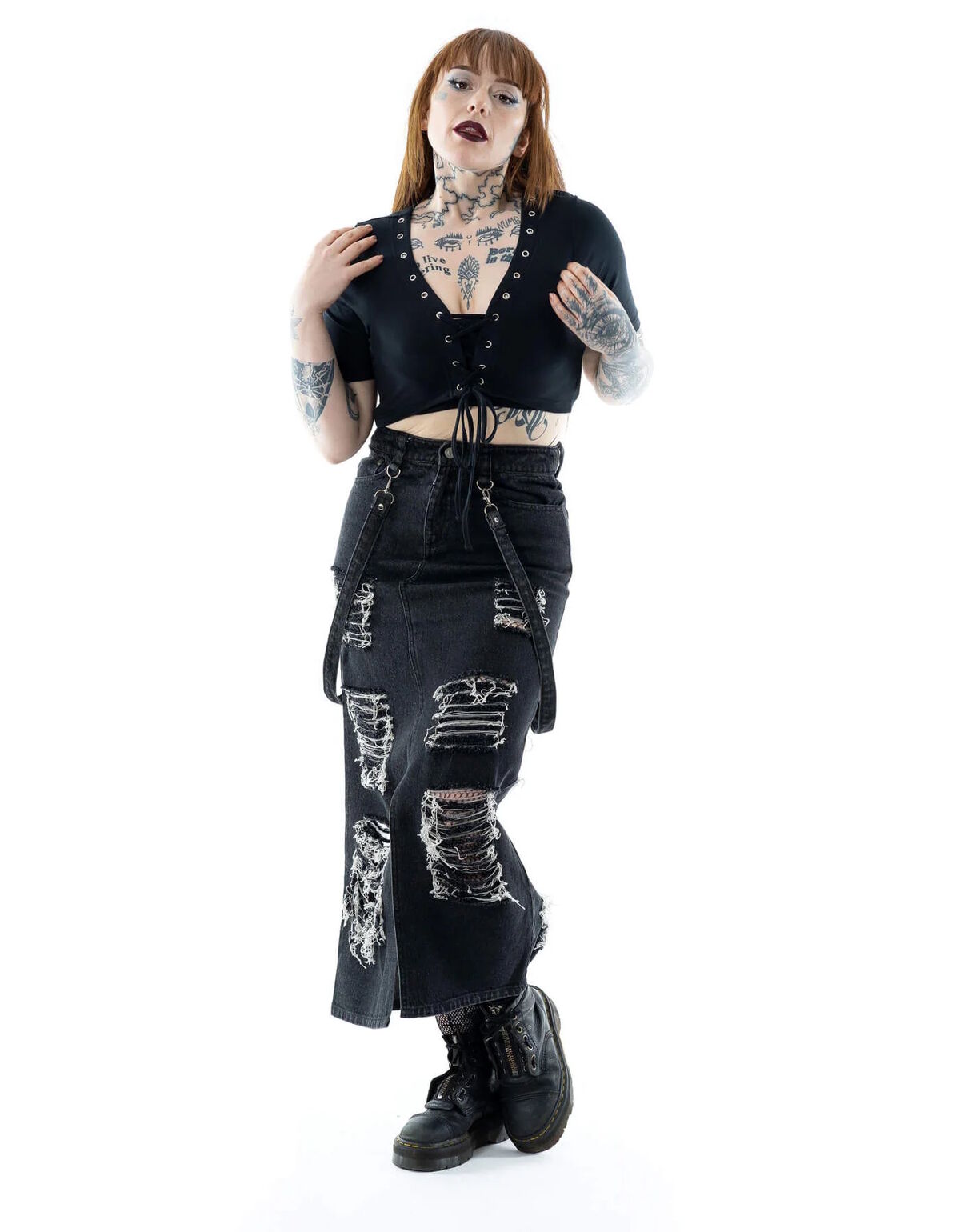 Polyvalente et visuelle, cette jupe est parfaite pour composer un look goth urbain, punk moderne ou alternative street.