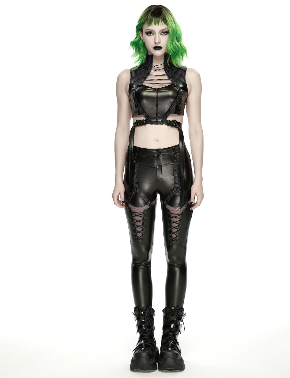 Ni legging, ni pantalon : une pièce hybride forgée pour les silhouettes cyberpunk, où le confort stretch rencontre une esthétique industrielle radicale.