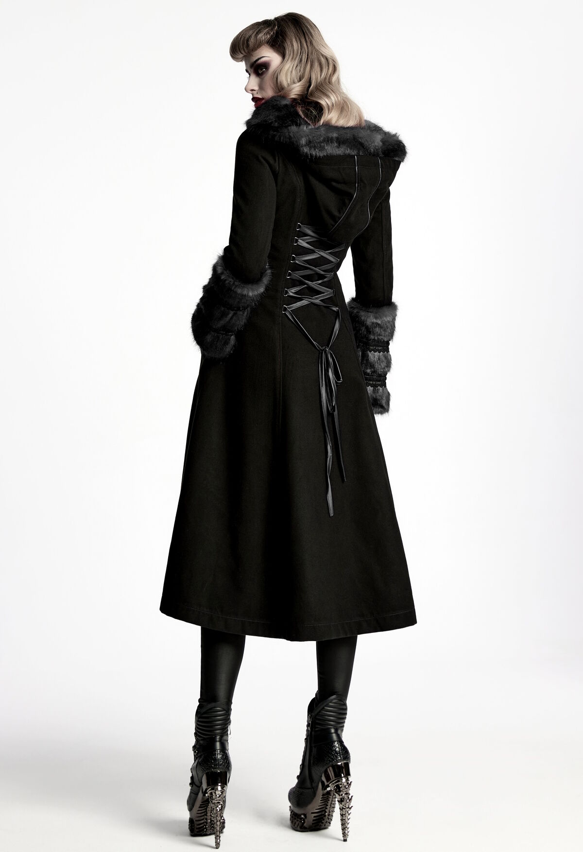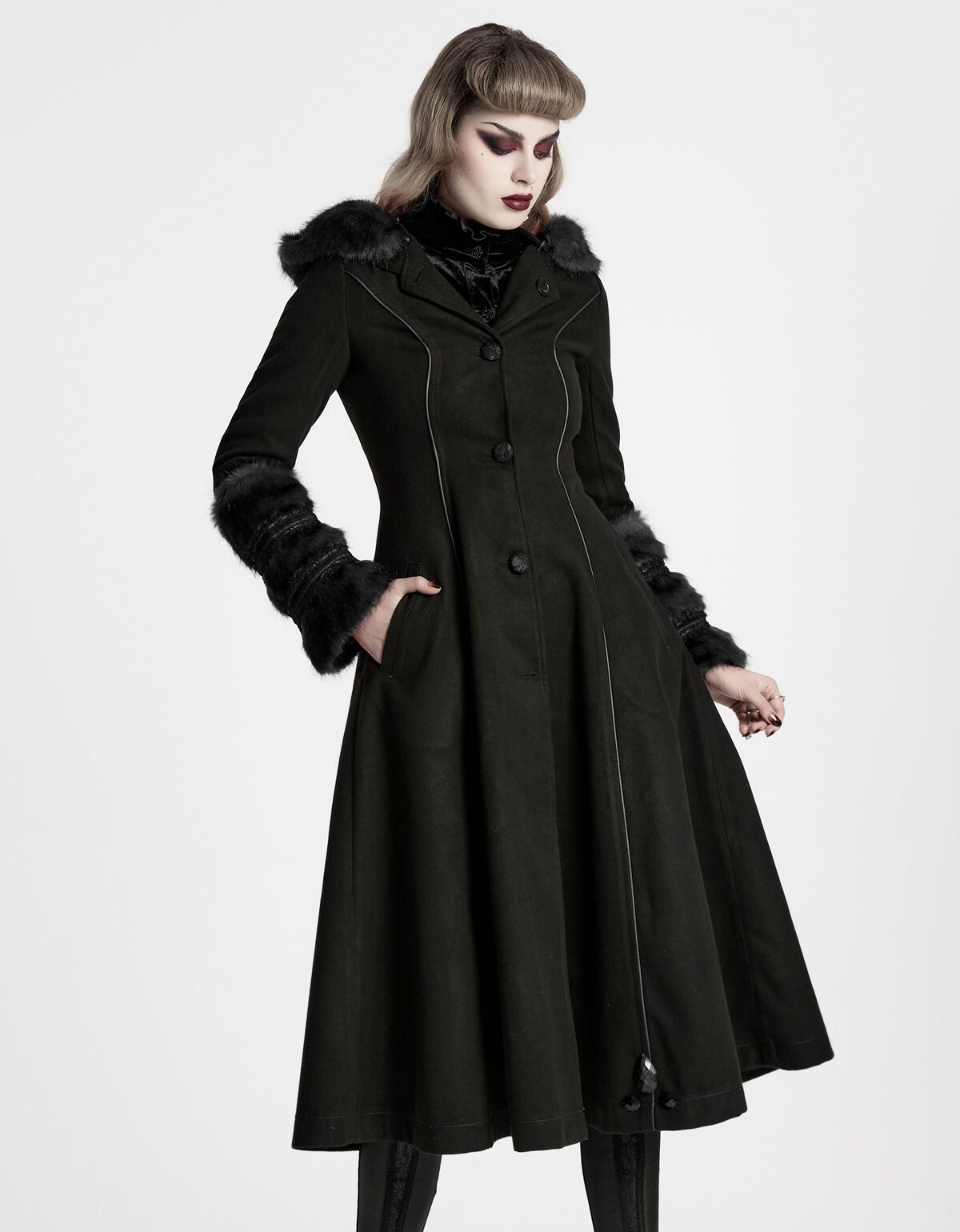 Un manteau spectaculaire pour affronter l’hiver avec élégance gothique. Ce long manteau en laine synthétique noire est doté d’une large capuche dramatique et orné de fourrure synthétique sur la capuche et les manches.