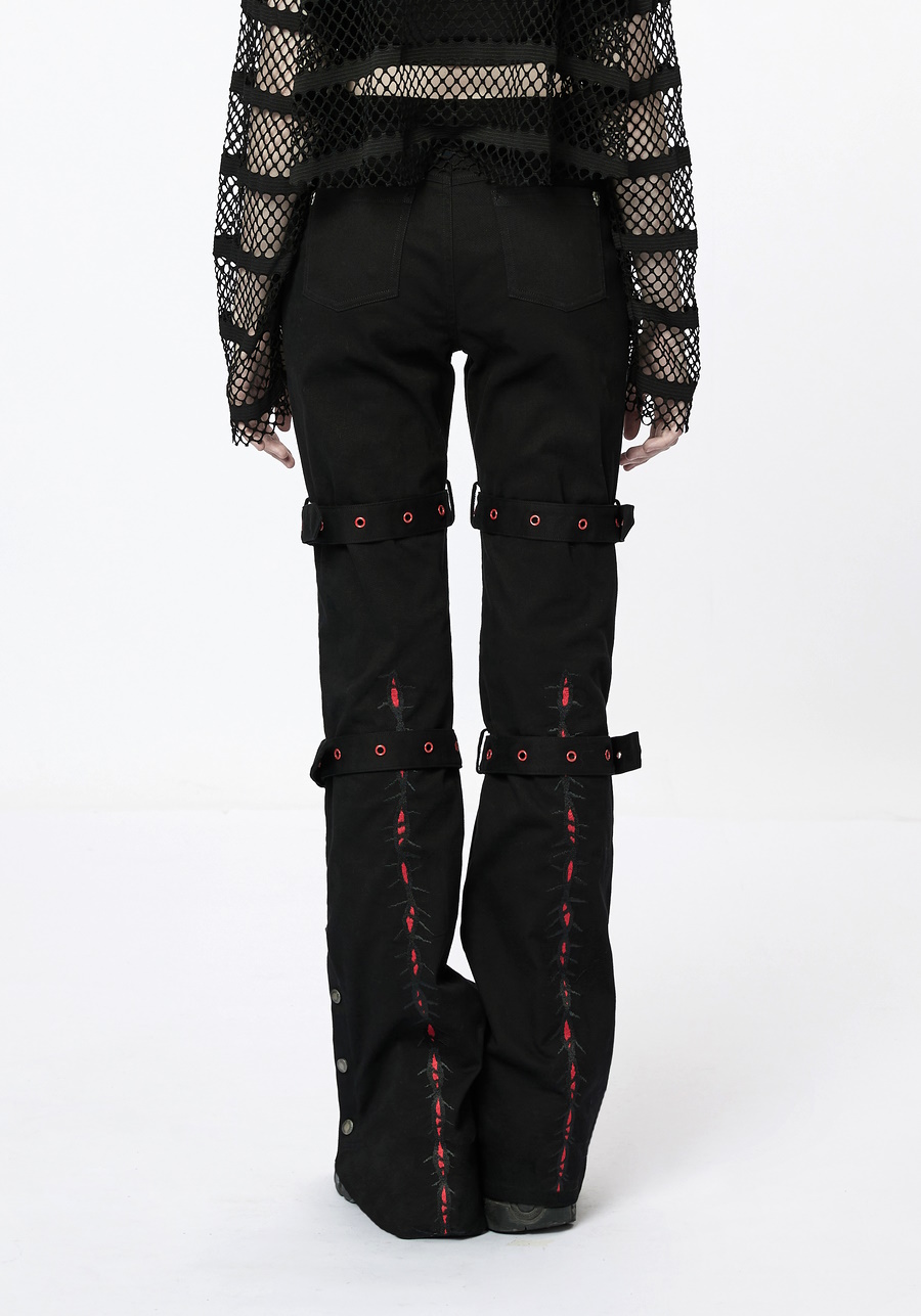 Pantalons gothiques noirs aux finitions corsetées, zippées ou lacées,