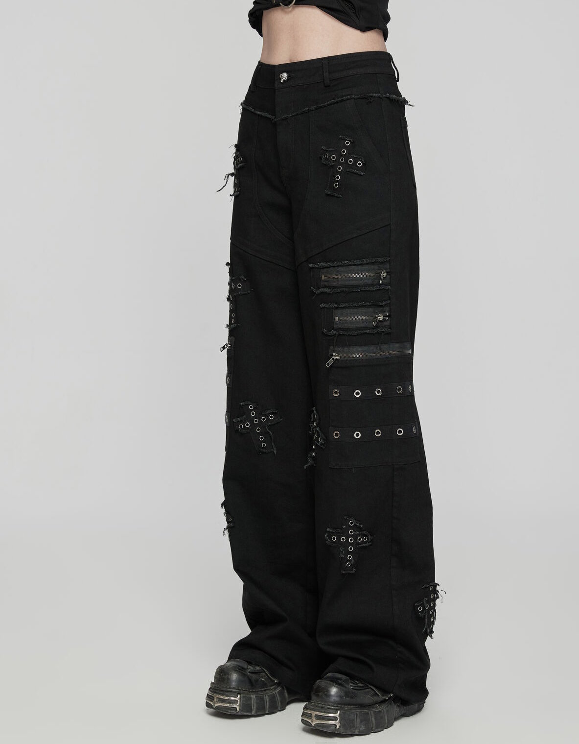 Pantalons gothiques noirs aux finitions corsetées, zippées ou lacées,