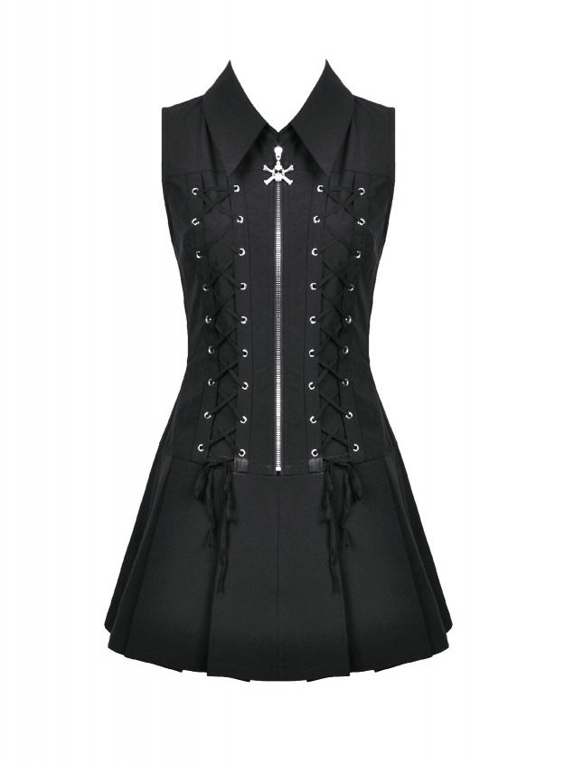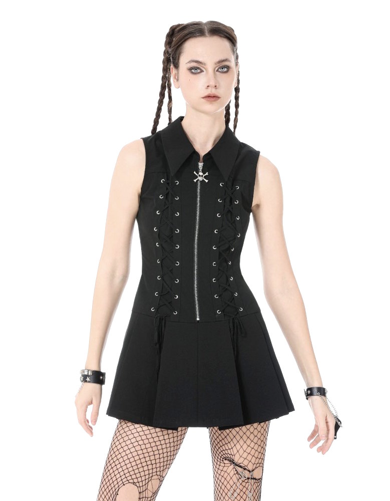 La Robe Discipline Noire Dark in Love s’inspire des codes du punk tactique et de l’uniforme détourné. Le buste lacé rappelle les corsets de contrôle, tandis que le zip central renforce l’esthétique industrielle et fonctionnelle.