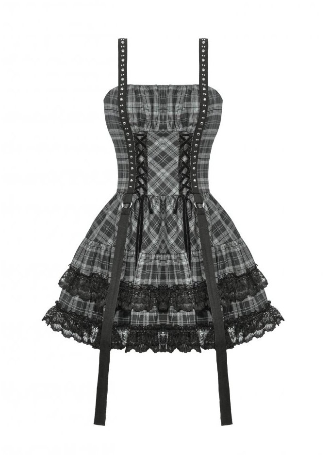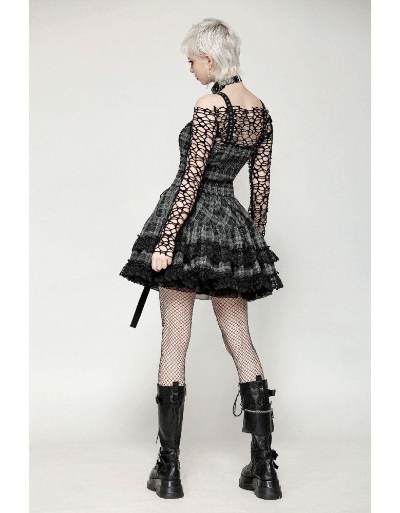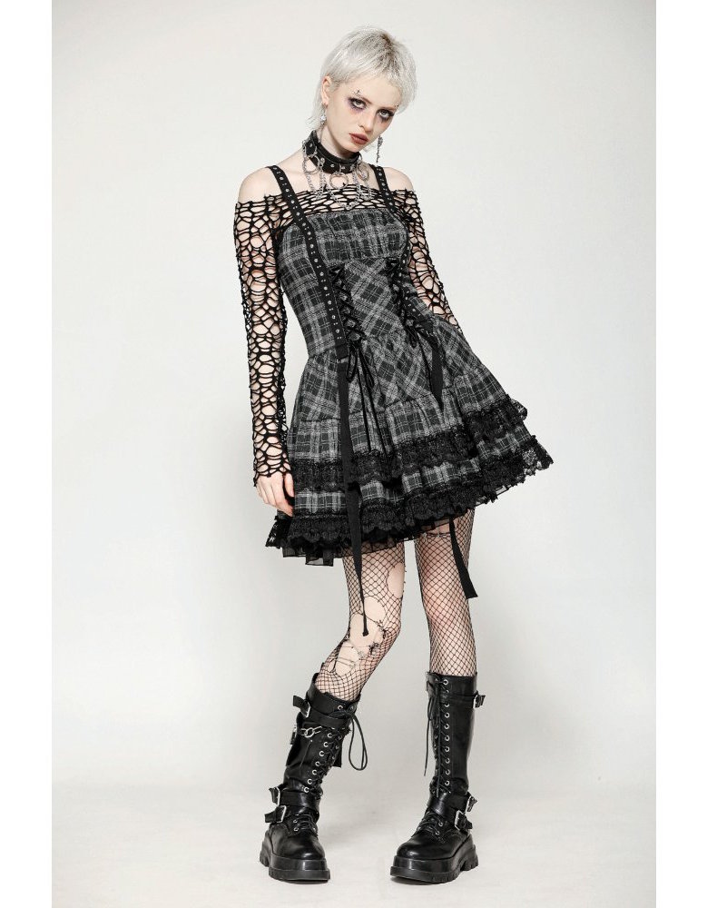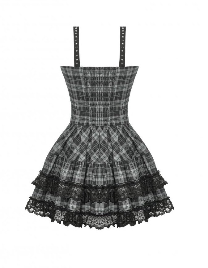 Son tissu à carreaux gris rappelle l’héritage punk, tandis que la dentelle noire et la coupe évasée adoucissent la silhouette dans une élégance sombre.