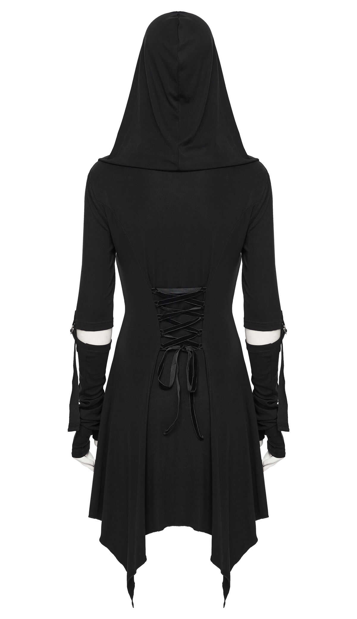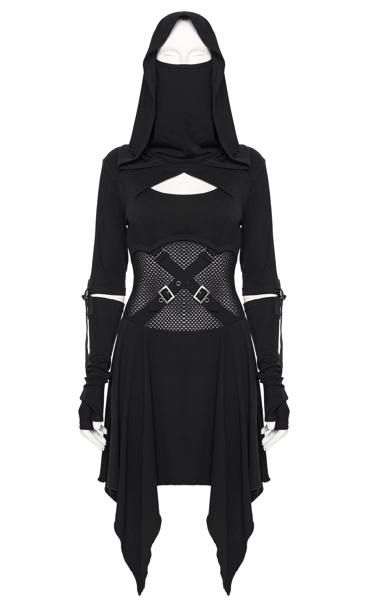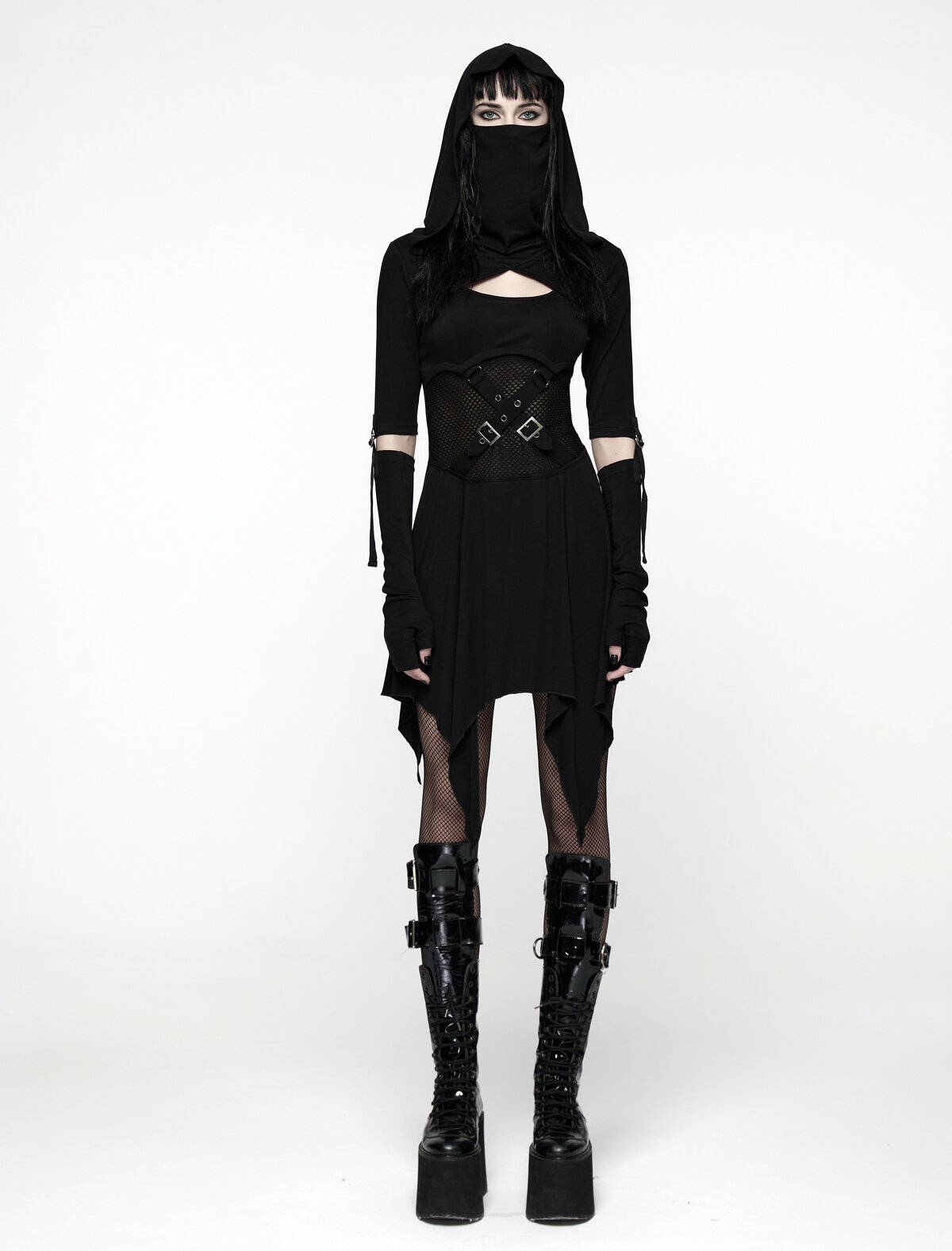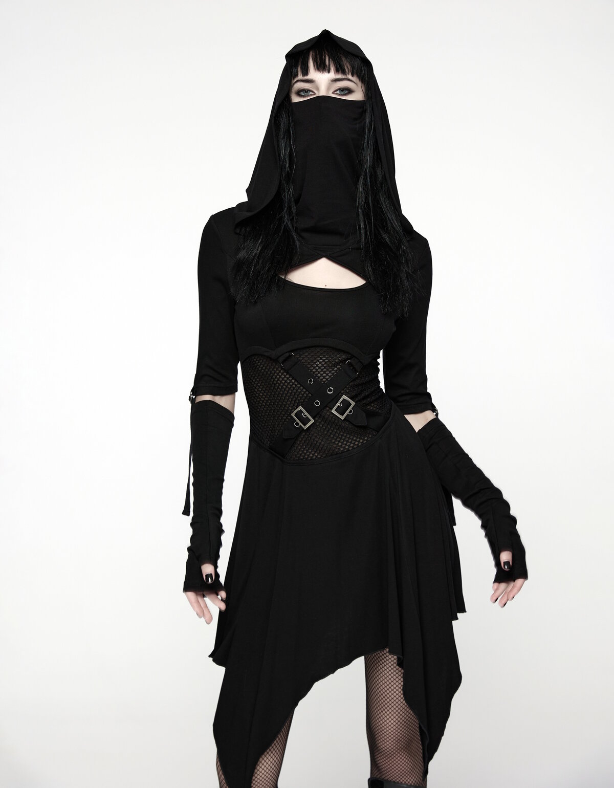 une capuche à col haut et un masque amovible pour une aura mystérieuse, des manches détachables pour moduler votre style, des découpes en mesh croisées à la taille pour structurer la silhouette.