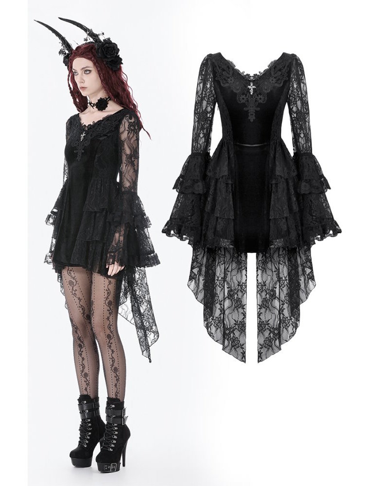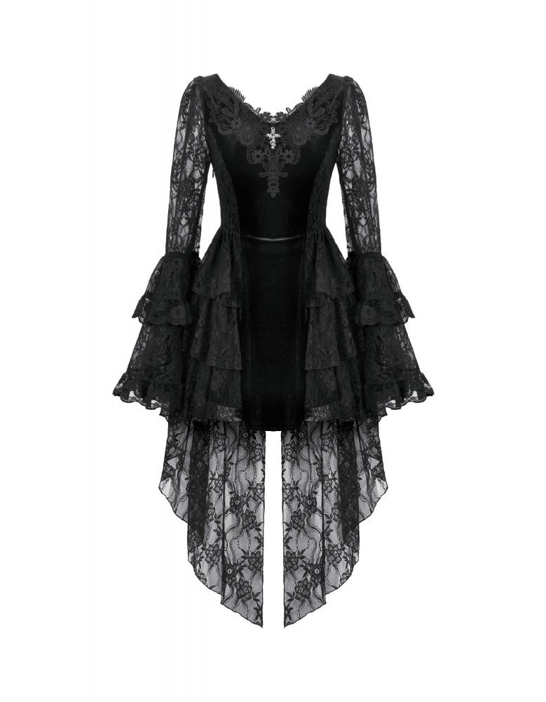 Confectionnée dans un velours noir intense, elle est sublimée par de délicates broderies gothiques et des détails de dentelle raffinée qui apportent profondeur et mystère à la silhouette.