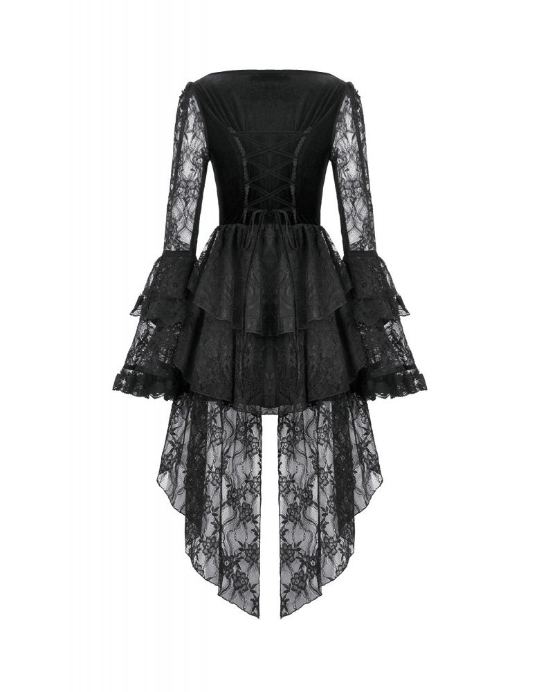 Les manches longues et les finitions délicates renforcent son esthétique romantique, rappelant les silhouettes sombres des bals victoriens.