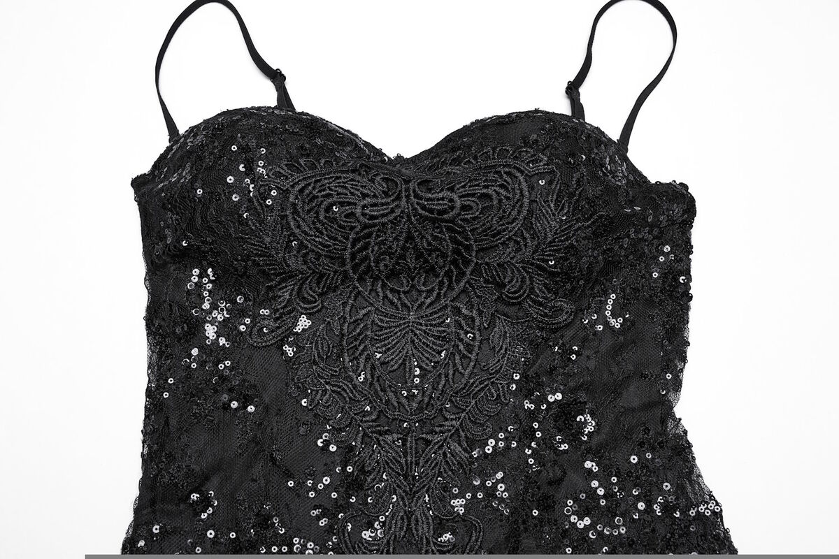 Avec son bustier ajusté orné de dentelle florale et de sequins, sa coupe sirène et sa jupe de gaze vaporeuse, elle évoque les grandes tragédiennes victoriennes ou les mariées fantômes des balades romantiques.