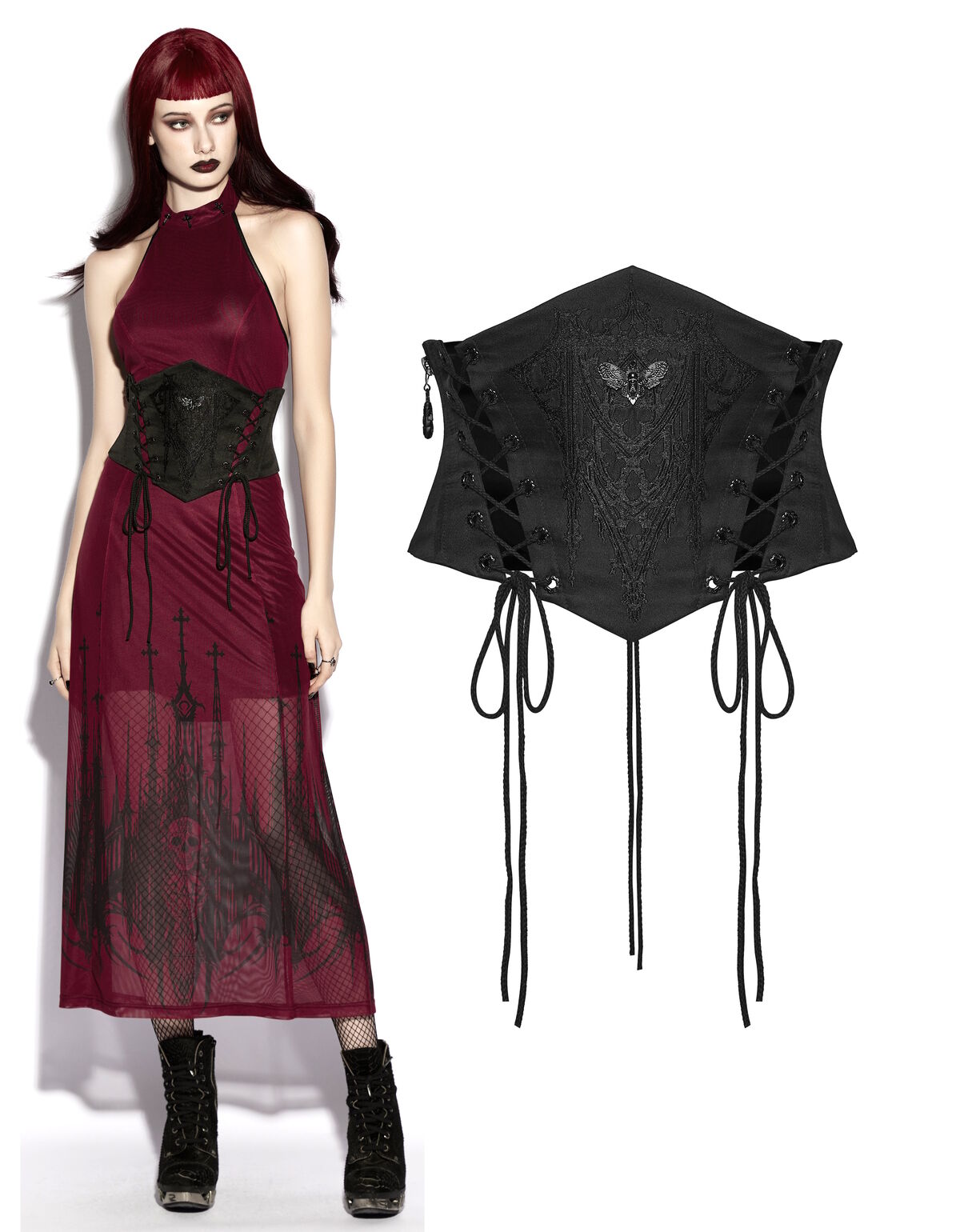 Le Serre-taille Cathédrale Obscure évoque les lignes majestueuses des cathédrales gothiques, transposées dans une pièce vestimentaire intense et sculpturale.