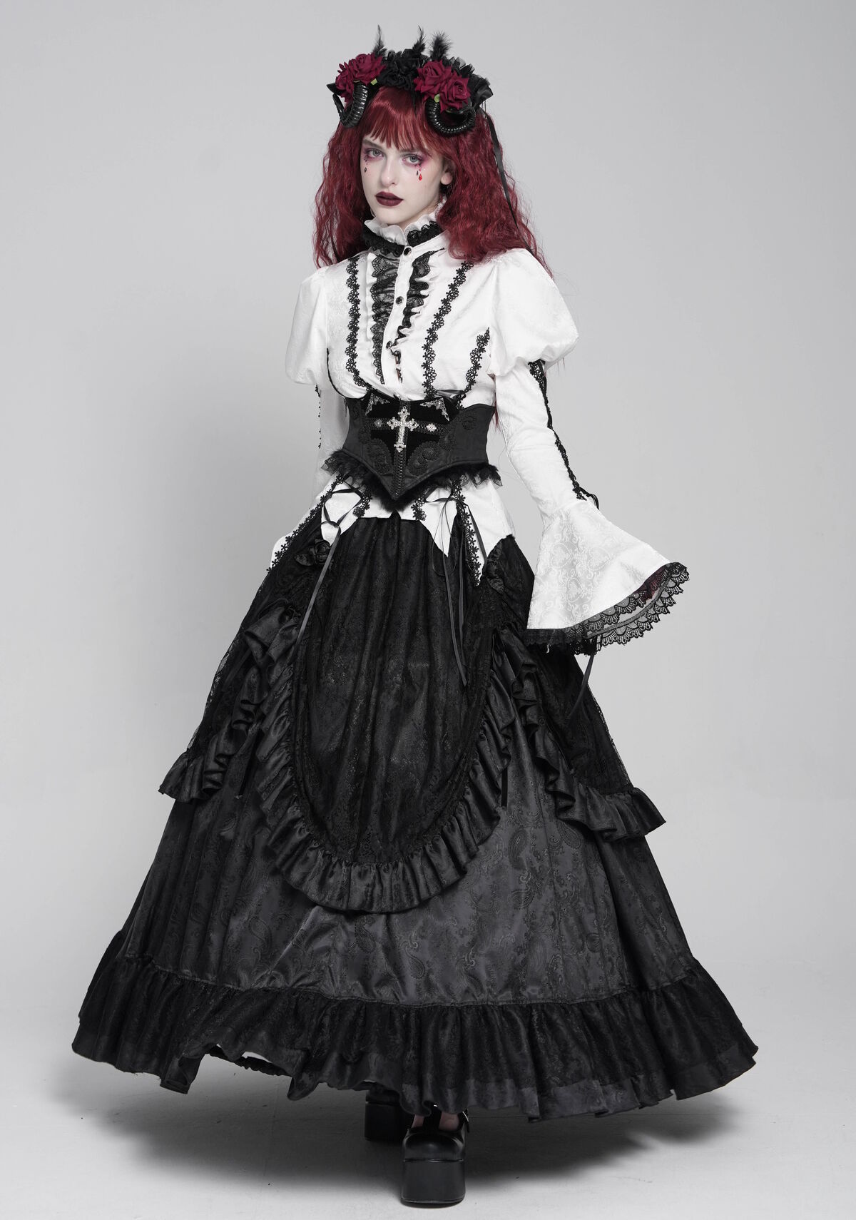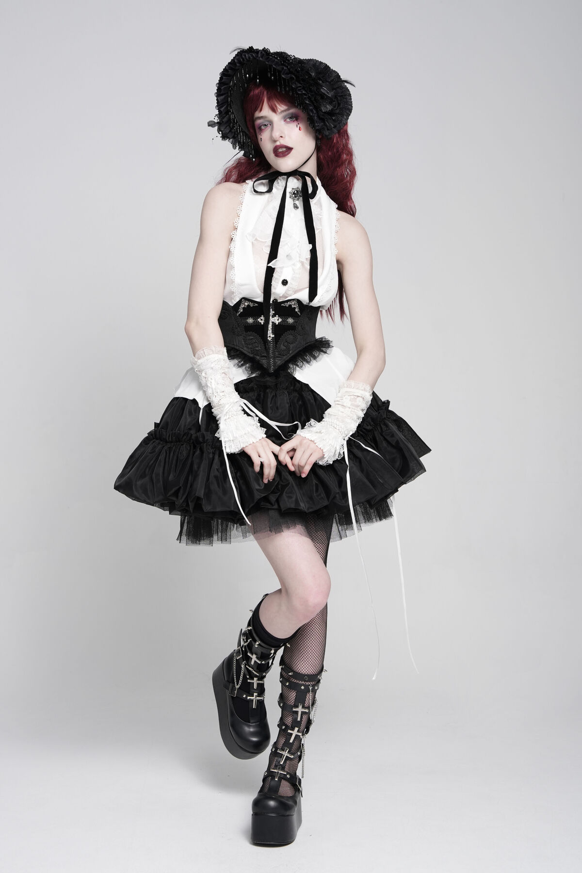 Sa structure serre-taille affine la silhouette tandis que les broderies noires et la croix centrale captent immédiatement le regard. La dentelle apporte une touche de fragilité contrastant avec la rigueur du corset, créant un équilibre parfait entre puissance et sensualité.