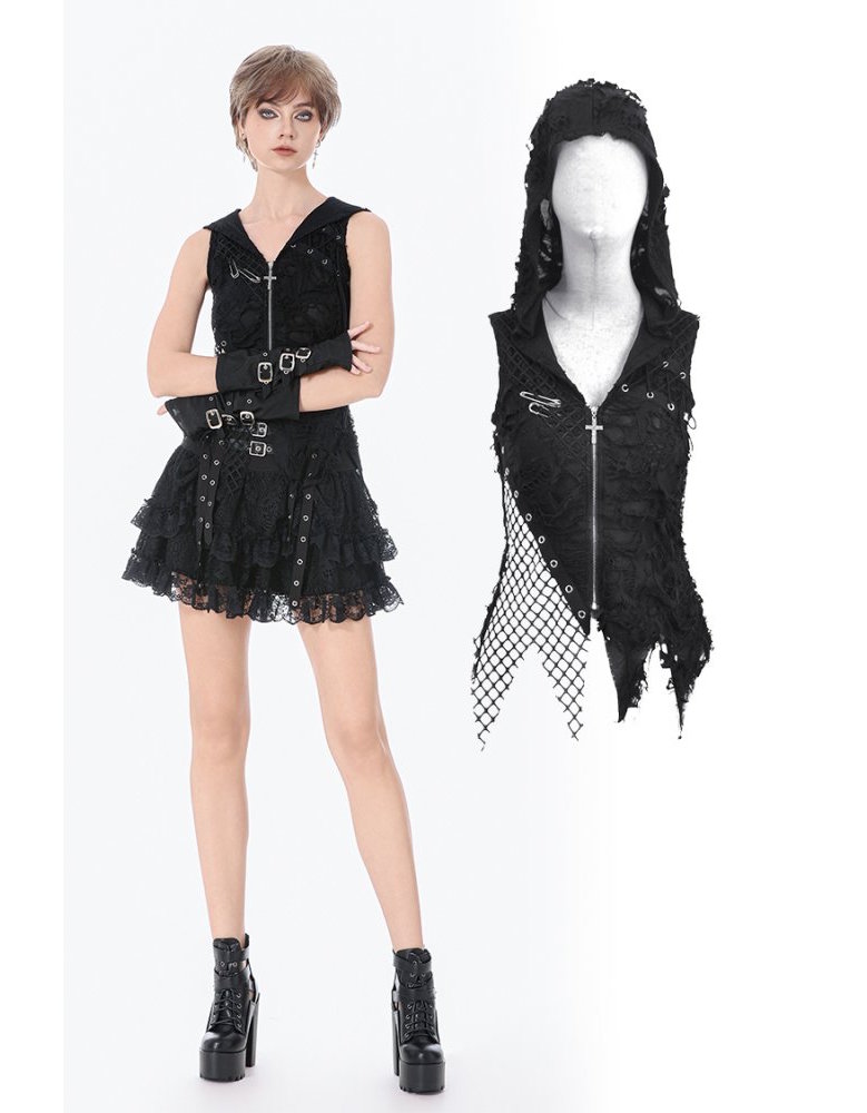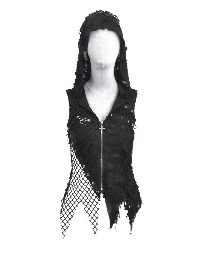 Le zip frontal orné d’une croix structure la silhouette, tandis que les superpositions de matières - tissu ajouré, résille et finitions effilochées - créent une esthétique brute, volontairement imparfaite.