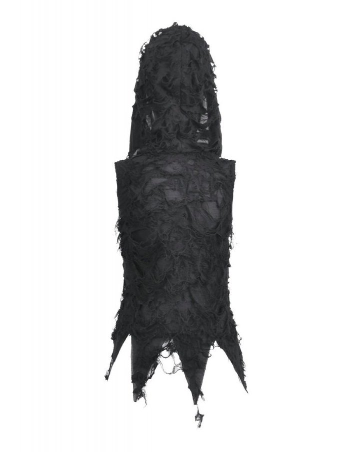 Sa capuche texturée semble avoir traversé le temps, comme un fragment arraché à un rituel païen ou à une scène underground oubliée.